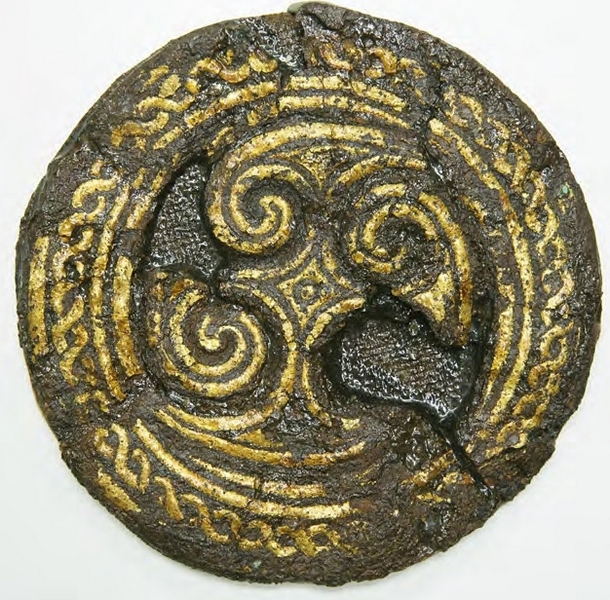 Falară de forma unui disc plat, ornamentat cu benzi înguste de foiţă de aur, dispuse în vrejuri spiralice, constând din patru cercuri concentrice, trei simple și unul în formă de colac, alte patru volute formează în mijloc un romb cu un punct în mijloc.