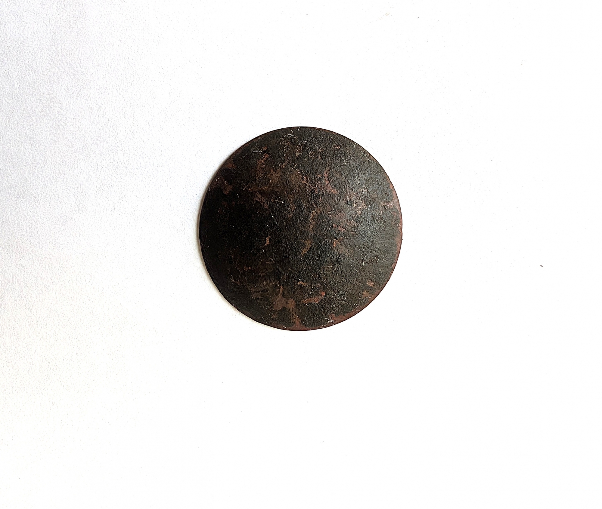 Aplică discoidală convexă, cu marginea ușor răsfrântă. Marginile sunt răsucite în interiorul verso-ului concav. Pe spate avea o gaică care se prindea probabil la vestimentația militară din perioada Imperiului Rus.