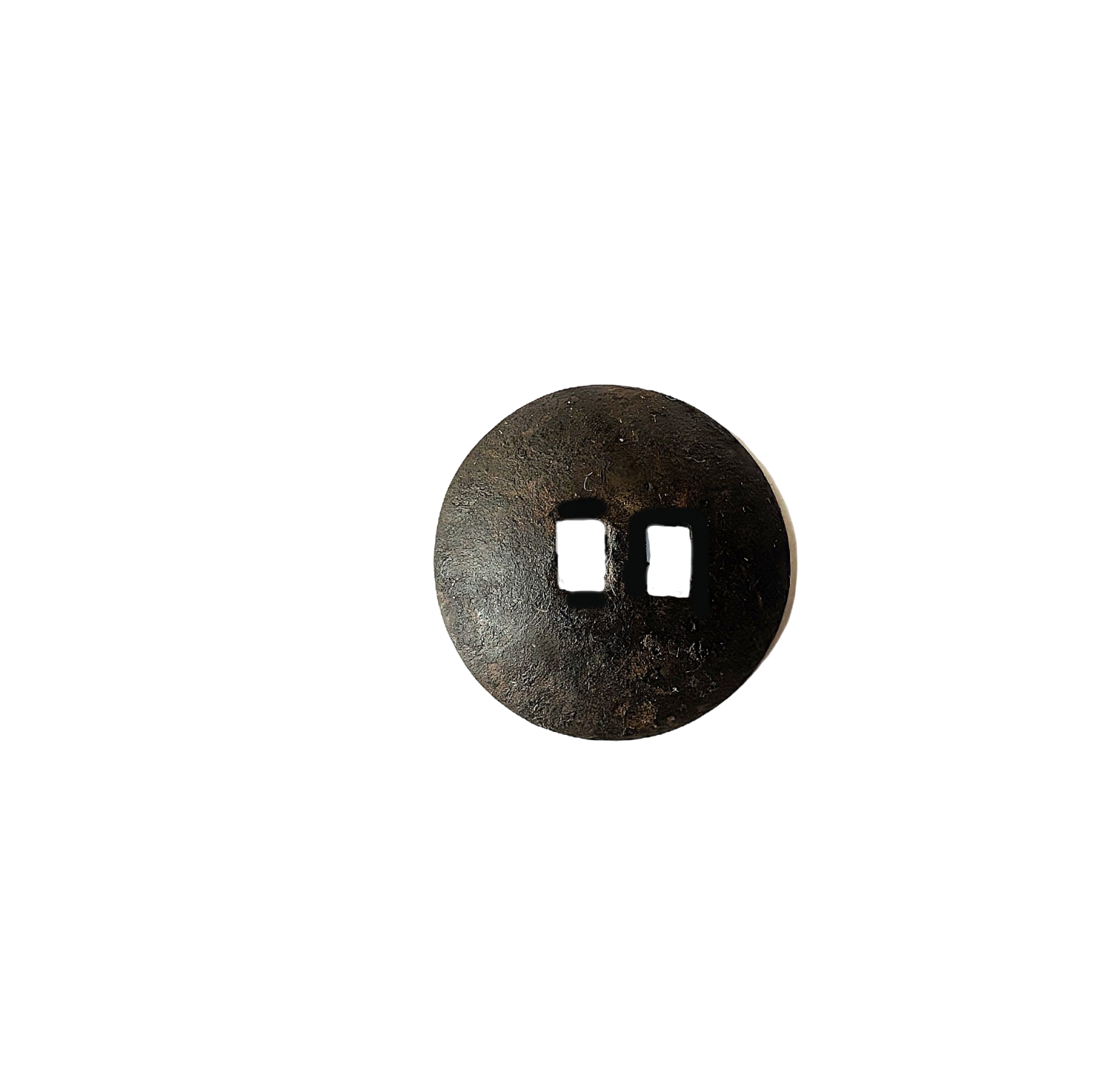 Aplică discoidală convexă, cu marginea ușor răsfrântă. Marginile sunt răsucite în interiorul verso-ului concav. În interior are 2 orificii dreptunghiulare. Se prindea probabil la vestimentația militară din perioada Imperiului Rus.