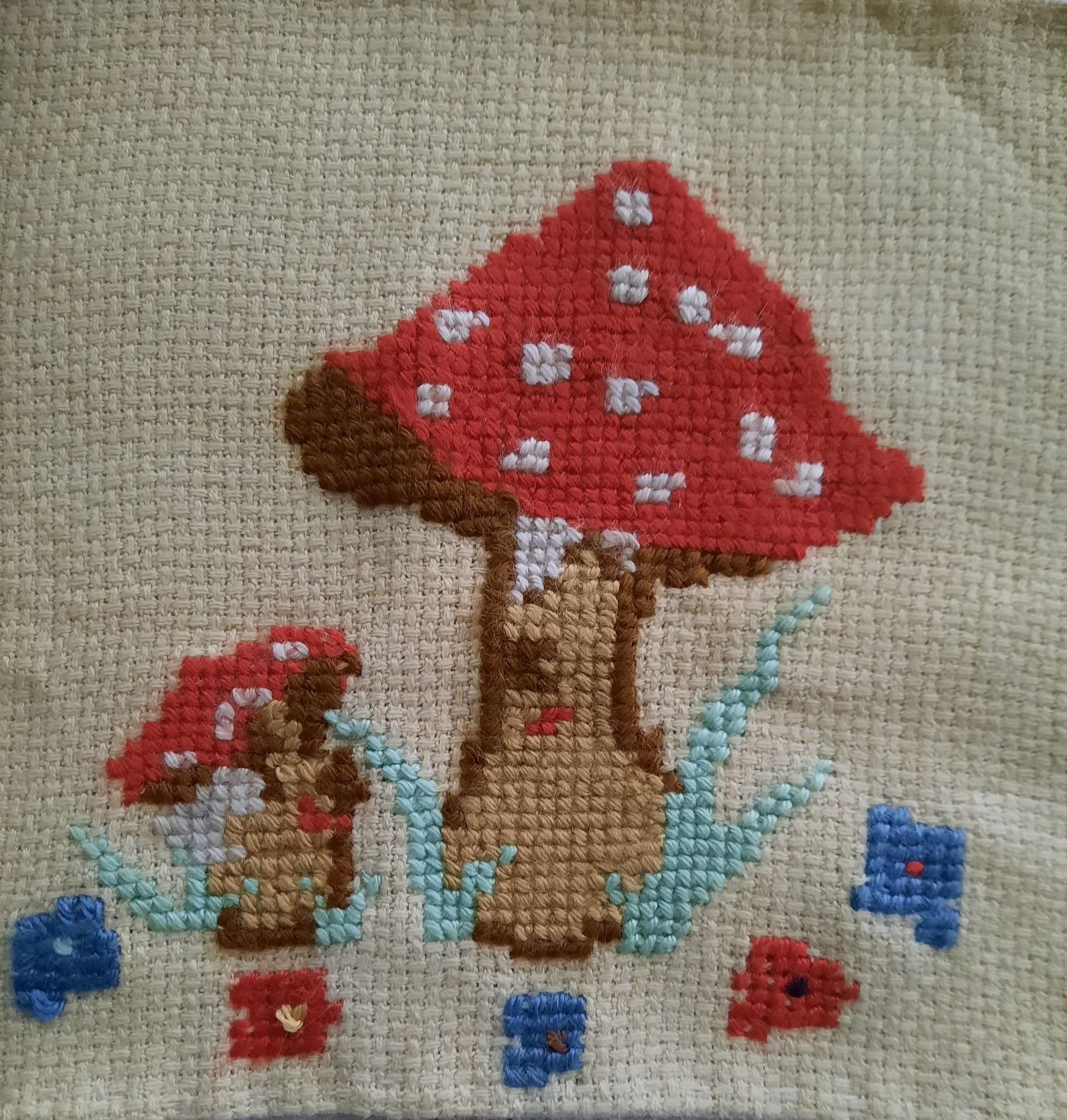 Broderie laică, forma dreptunghiulară, culoare deschisă, cu motive vegetale „Ciuperci”: mare și mică, cu pălării roșii și puncte albe, în jurul lor frunze verzi, cusut - punct cruce, cromatica multicoloră
