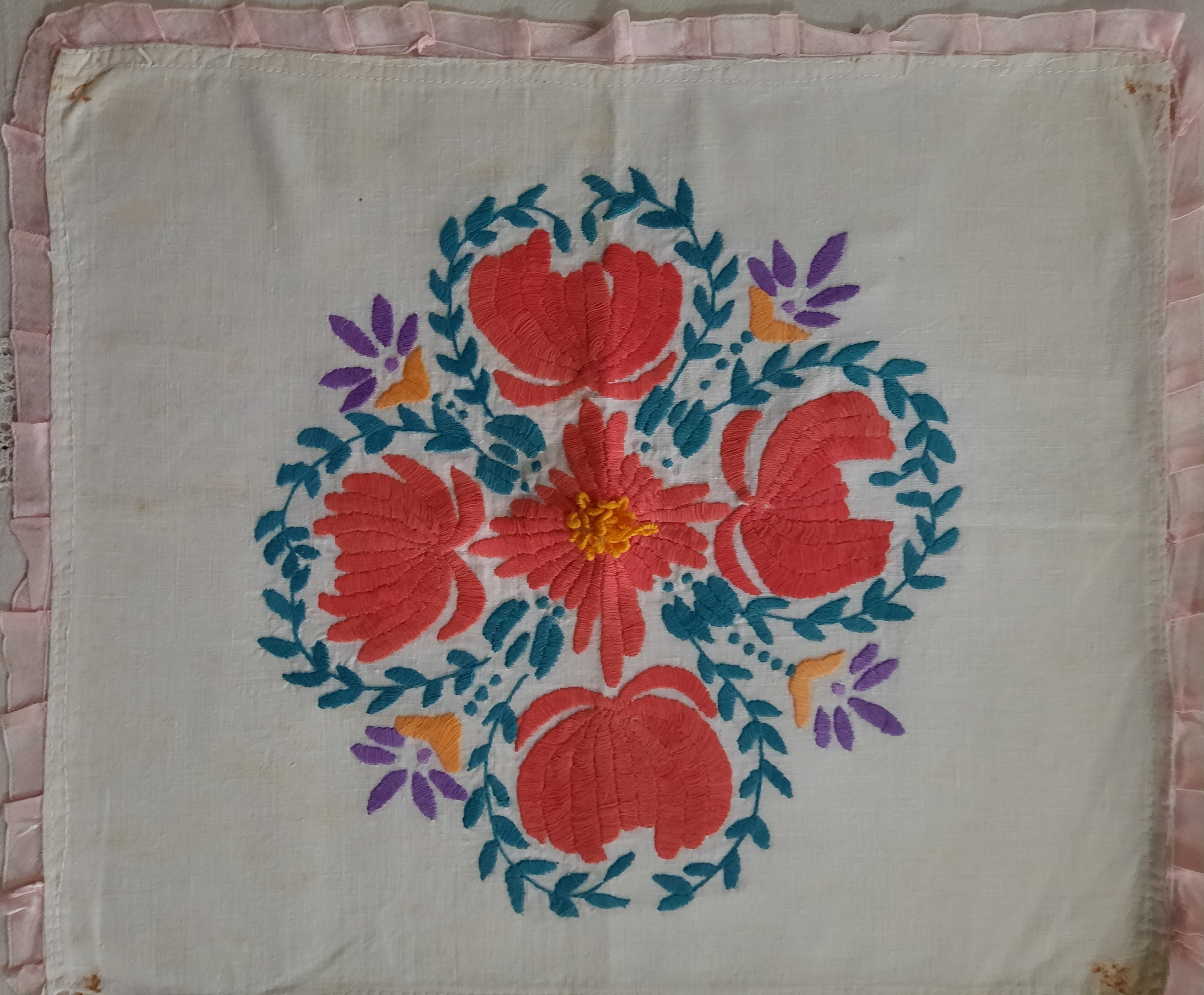 Broderie laică, formă dreptunghiulară, de culoare albă, decorul dispus în centru cu motive vegetale; cromatica bicoloră; pe margini înfrumusețată cu panglică roz