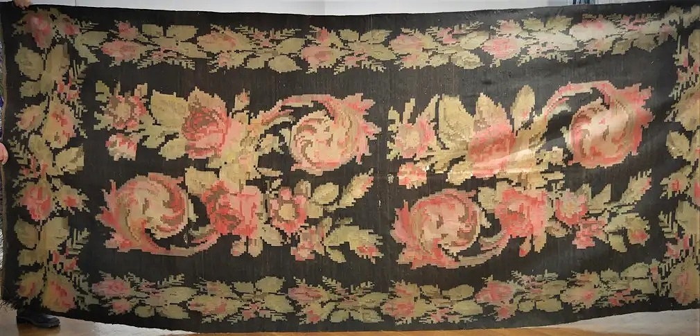 Covor cu decor vegetal redat într-o manieră ușor geometrizată („pixelată”). Tehnica de realizare este prin urzeală și băteală. Decorul este naturalist stilizat. Motivul principal – trandafirul volumetric din câmpul central – este dominant și apare sub formă de flori mari, deschise, cu petale ample, rotunjite și spiralate, dar și sub formă de boboci și flori laterale semi-deschise, aflate în diferite stadii de înflorire. Tulpinile sunt ușor arcuite.