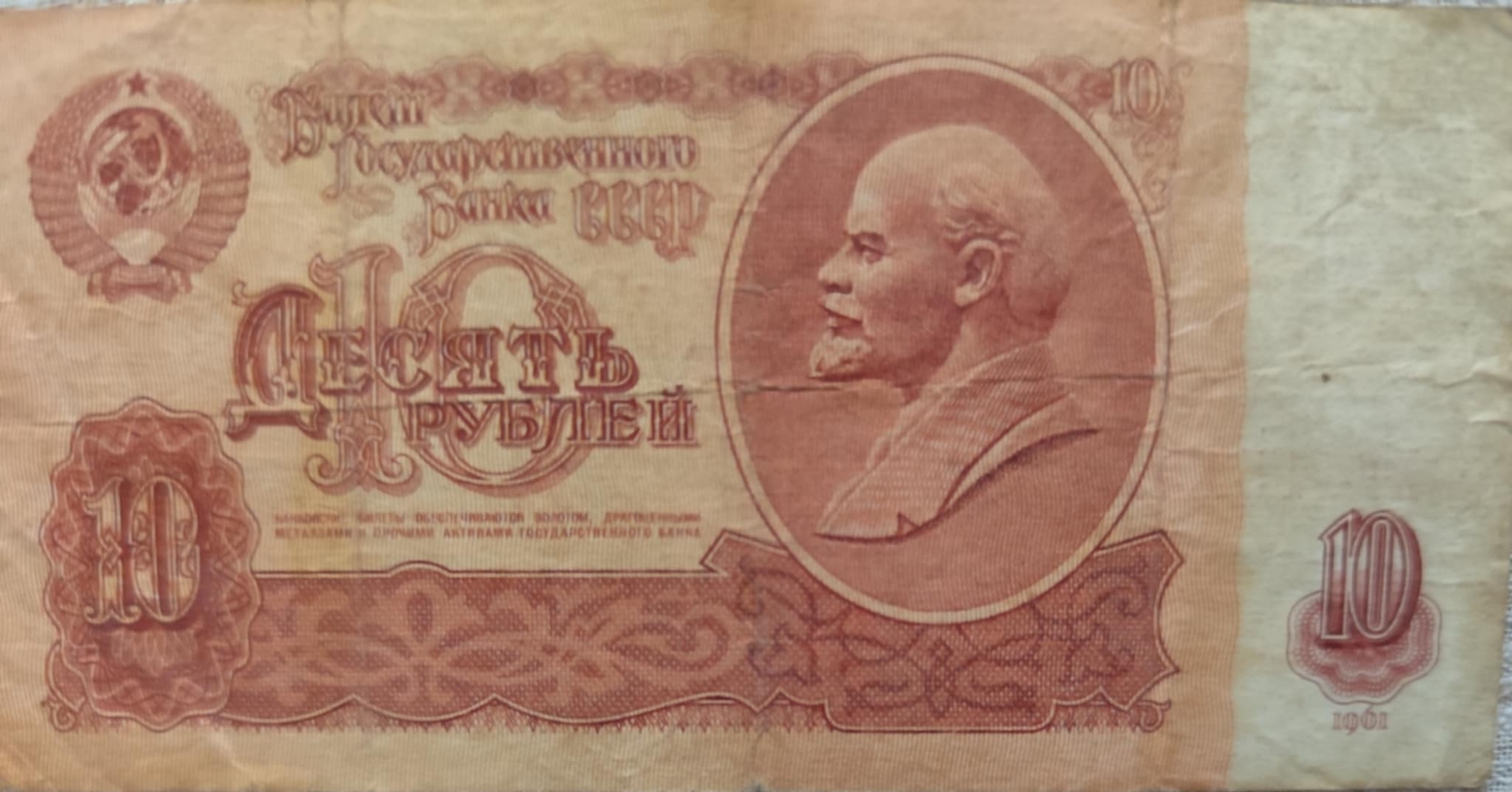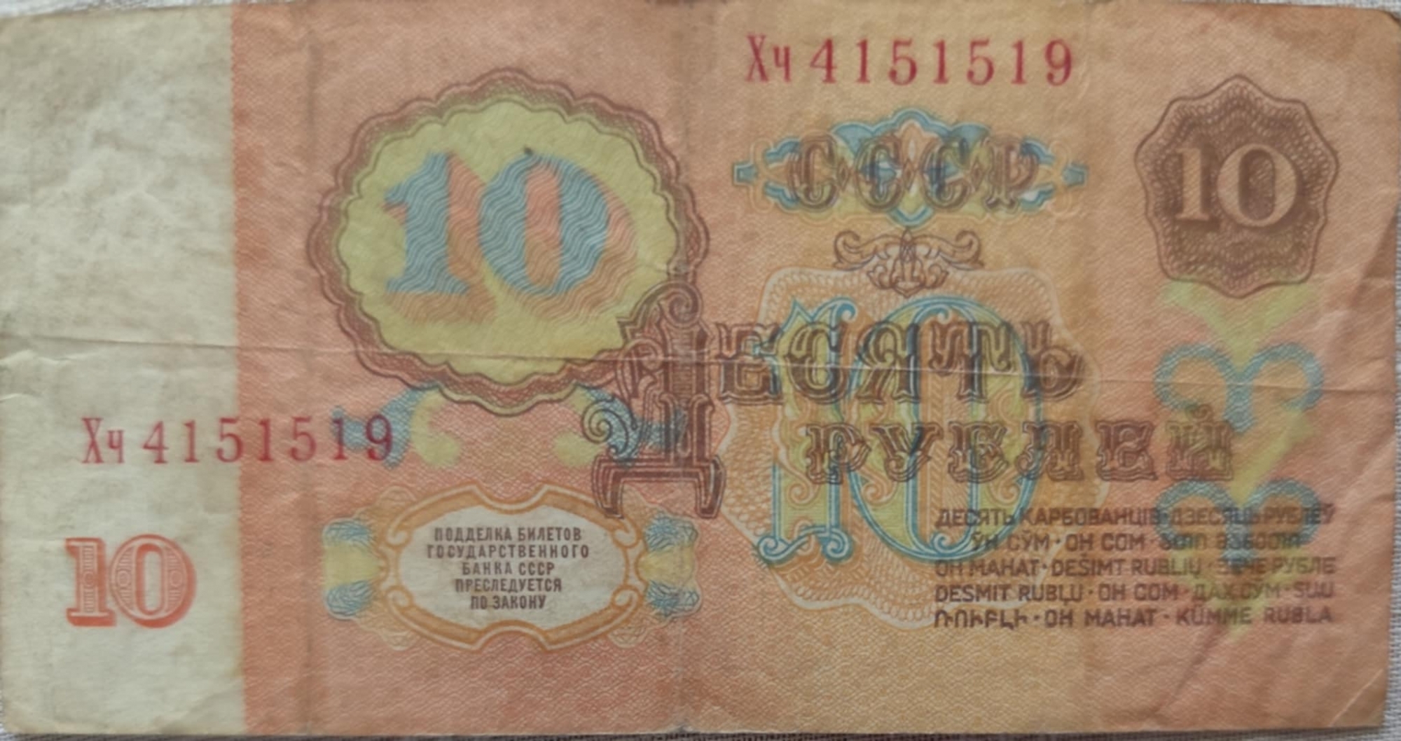 Bancnotă de formă dreptunghiulară cu nominalul de 10 ruble din URSS. Bancnota este predominant în nuanțe de roz și este decolorată puțin , fiind vizibilă vechimea. Pe revers bancnota are nuanțe de roșie- partocalie Într-un chenar oval pe partea stîngă sus, cu un desen albastru în interior este valoarea indicată nominală 10, care este indicată și într-un chenar rotund în colțul din dreapta sus și un 10 mai mic de culoare roșie în colțul din stînga jos. În centru valoarea este scrisă cu litere chirilice mari, stilizate , cu contur albastru și interior alb ДЕСЯТЬ РУБЛЕЙ ( Zece ruble). În partea de sus central - dreaptă și în partea de jos stînga este imprimată seria și numărul bancnotei Xч 4151519. Deasupra valorii nominale centrale este scris CCCP (URSS) într-un chenar decorativ. În partea stîngă jos , într-un chenar decorativ este un text scris cu litere chirilice în care se specifică despre faptul că ,,Falsificarea bancnotelor de stat se pedepsește prin lege,, Pe partea dreaptă ,sub valoarea nominală în litere este repetată valoarea nominală în toate limbile țărilor membre URSS . Pe aversul bancnotei pe partea partea centrală stînga , dar și în colțul din dreapta jos este imprimată cifra mare 10, iar sub număr este scrisă valoarea nominală cu litere ДЕСЯТЬ РУБЛЕЙ ( Zece ruble). În partea superioară centrală este scris cu litere chirilice БИЛЕТ ГОСУДАРСТВЕННОГО БАНКА СССР (Bilet al Băncii de Stat a URSS). Pe partea dreaptă a bancnotei, într-un cerc este un portret a lui Vladimir Lenin, cu profilul orientat spre dreapta. În colțul din stînga sus este vizibilă stema Uniunii Sovietice, cu secera și ciocanul înconjurate de spice de grîu .Sub valoarea nominală este un text mai mic care se referă la faptul că ,, Biletele bancare sunt garantate cu aur, metale prețioase și alte active ale băncii de stat. În colțul din dreapta jos se valoarea nominală 10 este indicat anul emiterii 1961. Pe suprafața bancnotei există mai multe motive decorative stilizate