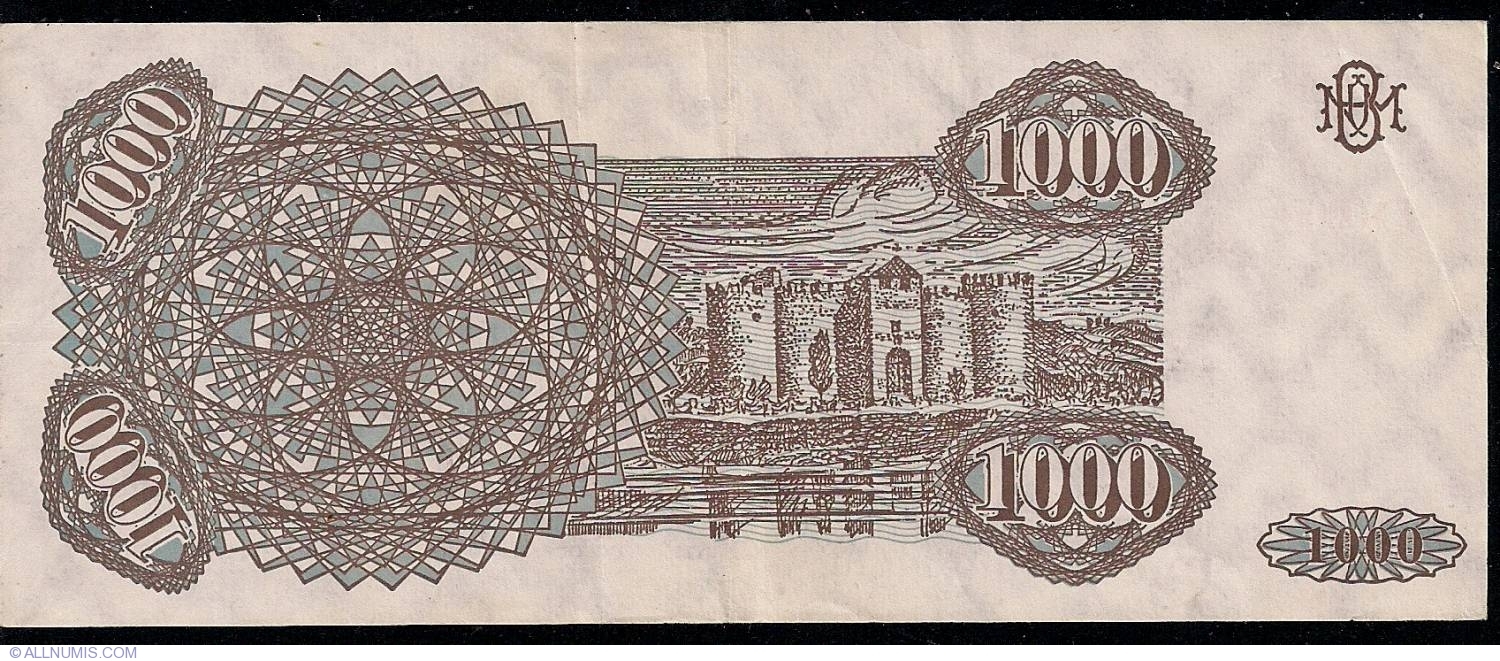 Pe partea dreaptă este stema țării -vulturul cu un scut central, un cap de bour și un vultur cu cruce în cioc. În colțul din stânga sus este un monogram cu literele stilizate "BNM" (Banca Națională a Moldovei) Un număr de serie scris cu culoare roșie, "A.0001" este pe partea stângă, iar sub valoarea nominală este al doilea număr de serie albastru, "408791", sub valoarea nominală. Bancnota are un design complex, cu linii fine și modele circulare, care pornesc din spatele stemei. Culoarea dominantă este o combinație de albastru-gri pe un fundal deschis. Pe revers este indicată valoarea nominală, "1000", scrisă în cifre în cele patru colțuri ale bancnotei și într-un format orizontal jos, în partea dreaptă. Partea stângă a bancnotei este dominată de un design elaborat, de tip rozetă sau mandală, format din linii fine, curbe și geometrice care se întrepătrund. Acest model intricate are, de asemenea, cifrele "1000" încorporate în design. Secțiunea centrală și cea din dreapta prezintă o imagine a unei clădiri, care pare a fi un castel sau o fortăreață, cu turnuri crenelate și un pod peste un râu sau un lac. Deasupra castelului, se poate vedea un cer noros sau un peisaj stilizat. În colțul din dreapta sus se află o monogramă sau un simbol, format din literele "M" și "R", așezate una peste alta.