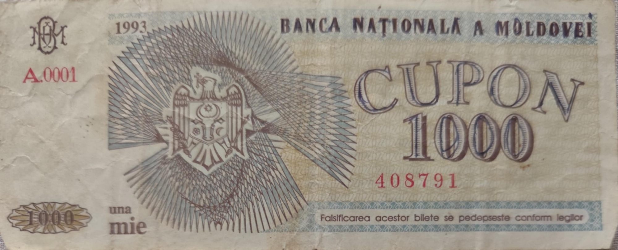 Bancnotă de formă dreptunghiulară cu valoarea nominală 1000 cupoane moldovenești. Pe aversul bancnotei se poate observa inscripționată valoarea nominală: "1000" CUPON cu caractere mari și clare. De asemenea, valoarea este scrisă și în litere: "o mie", deasemenea este indicată banca emitentă: "BANCA NAȚIONALĂ A MOLDOVEI". Pe bancnotă este un avertisment: "Falsificarea acestor bilete se pedepsește conform legilor". În partea stîngă sus este anul emiterii: "1993"