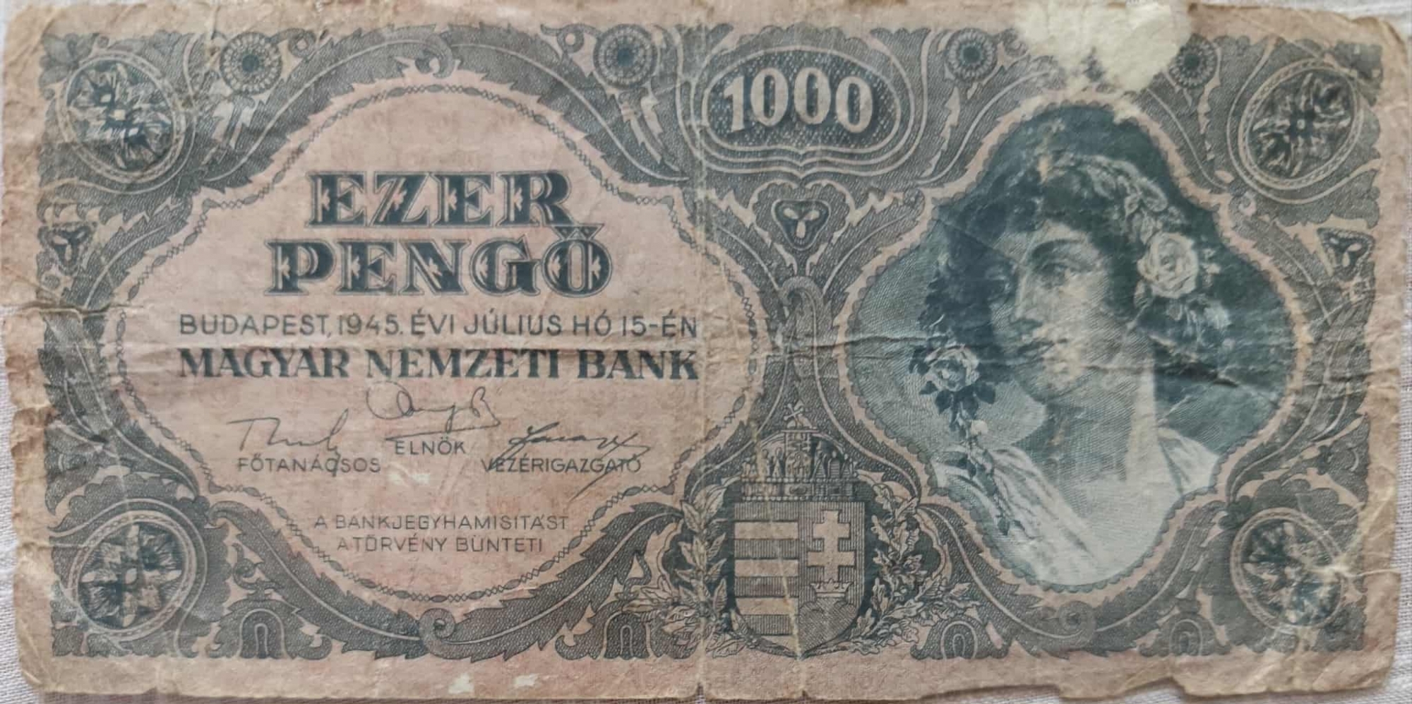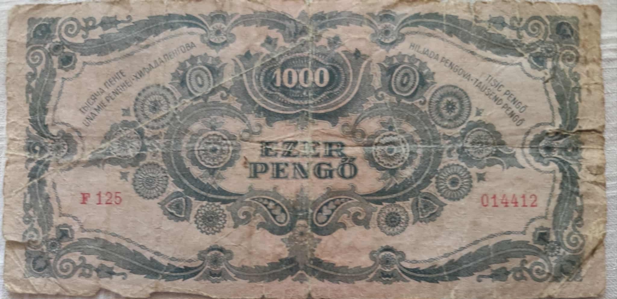 Bancnota de formă dreptunghiulară cu valoarea de 1000 Pengő a fost valuta Ungariei între anii 1927 și 1946. Pe aversul bancnotei pe centru este indicată valoare nominală: 1000 (O mie) Pengő. Conform textului de pe aver(, bancnota a fost emisă la Budapesta, 15 iulie 1945. În partea stângă, se află un portret stilizat al unei femei cu floare în păr, iar în centru, se găsește stema Ungariei. Sub stema și portret, sunt semnăturile oficialilor băncii, cu titlurile "Főtanácsos" (Consilier principal), "Elnök" (Președinte) și "Vezérigazgató" (Director general). Pe reversul bancnotei valoarea nominală "1000" este afișată în centru, alături de textul "EZER PENGŐ"( O mie Pengő), fiind scrisă valoarea nominală și în alte limbi germană, sârbă , ndicând "MIE PENGŐ", "TAUSEND PENGŐ", afășat în partea de sus. În stânga jos și în dreapta jos sunt numerele de serie ale bancnotei, în acest caz F 125 și 014412. Bancnota a circulat într-o perioadă de hiperinflație extremă în Ungaria, una dintre cele mai severe din istoria mondială. Datorită inflației galopante, valoarea pengő-ului a scăzut rapid, ceea ce a dus la înlocuirea sa cu forintul în anul 1946.