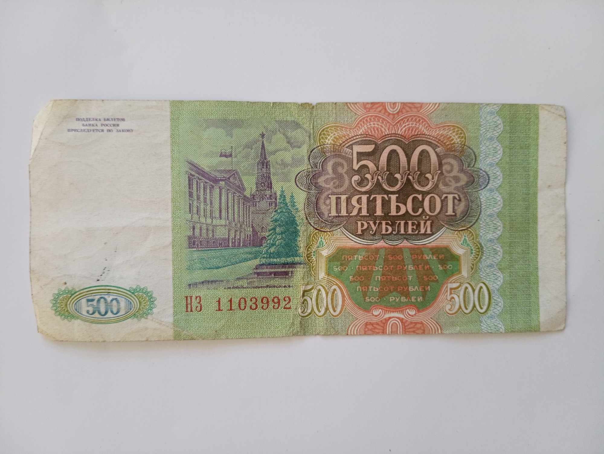 Bancnotă de formă dreptunghiulară cu nominalul de 500 ruble, din modelul din 1993, emisă de Banca Națională a Rusiei. Introduse pe 26 ianuarie 1993, pe lângă bancnotele de tip sovietic, din 26 iulie 1993 au rămas singura monedă legală de plată a acestei denominațiuni. Acestea au fost oficial în circulație până la reforma din 1998.