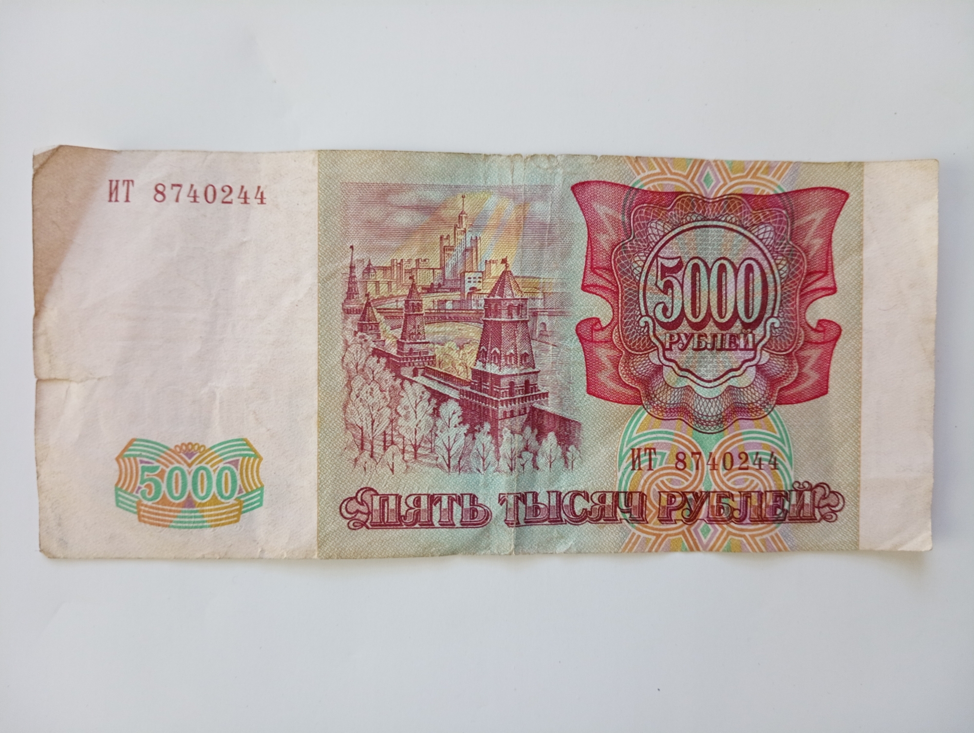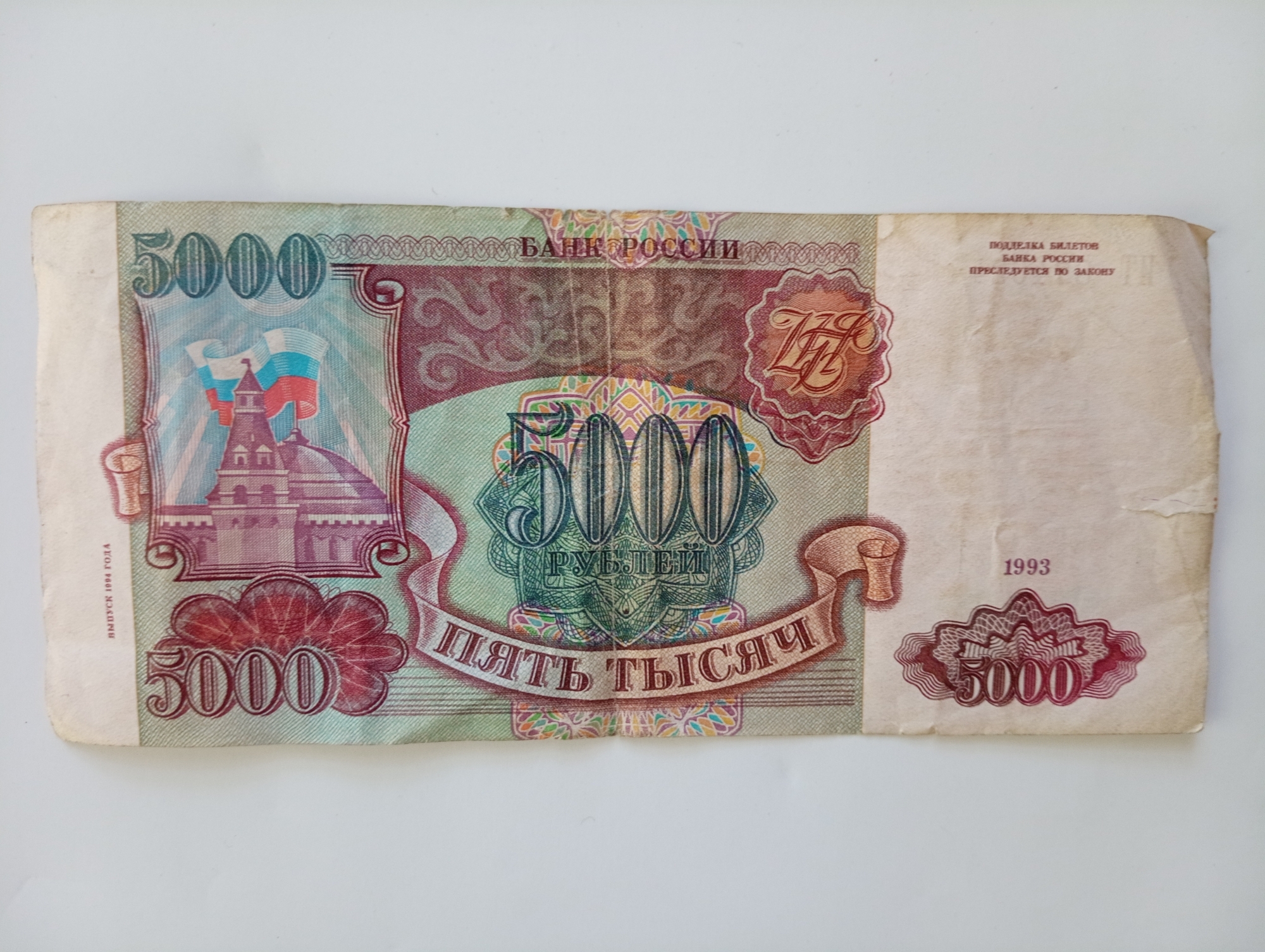 Bancnotă de formă dreptunghiulară cu nominalul de 5000 ruble, din modelul din 1993, emisă de Banca Națională a Rusiei. Introduse pe 26 ianuarie 1993, pe lângă bancnotele de tip sovietic, din 26 iulie 1993 au rămas singura monedă legală de plată a acestei denominațiuni. Acestea au fost oficial în circulație până la reforma din 1998. În 1994, au fost emise bancnote modificate, care diferă prin unele elemente vizibile la lumina ultravioletă, precum și prin inscripția „EMISIA ANULUI 1994”. Pe avers, are un câmp colorat situat în stânga centrului. În mijloc, pe fundalul unui model, este indicată valoarea nominală - „5000”, mai jos cu font mai mic este cuvântul "РУБЛЕЙ" („RUBLE”), iar și mai jos, în interiorul unei panglici semicirculare stilizate suprapuse peste linii cu microtext, valoarea nominală este repetată în cuvinte -"ПЯТЬ ТЫСЯЧ" („CINCI MII”). În partea de sus, deasupra modelului orizontal, se află inscripția "БАНК РОССИИ" („BANKA RUSSIEI”), sub ea se află o zonă pictată cu un ornament vegetal, delimitată de jos de o linie semicirculară (în partea dreaptă, deasupra modelului, se află un cadru figurat cu literele „CBR” - emblema Băncii Rusiei). În partea stângă a zonei colorate se află un sul stilizat cu imaginea Turnului Senatului din Kremlinul din Moscova și a Palatului Senatului, deasupra căruia se află steagul Federației Ruse. În stânga sus se află numărul „5000”, în partea de jos, sub sul, se află o ramă figurată cu un model, pe marginea din stânga jos a cărei este suprapus un alt număr „5000”. În câmpul mare alb pentru cupoane din dreapta, în partea de sus, pe trei rânduri se află inscripția: "ПОДДЕЛКА БИЛЕТОВ БАНКА РОССИИ ПРЕСЛЕДУЕТСЯ ПО ЗАКОНУ" („FALSIFICAREA BILETELOR BANK OF RUSSIA ESTE PEDEPSITĂ DE LEGE”), în partea de jos este anul eșantionului de bancnotă - „1993” și un model de linii ondulate cu numărul „5000”. Pe revers, există și un câmp colorat, deplasat spre dreapta. În partea stângă a acestui câmp se află o gravură care înfățișează turnurile Kremlinului din Moscova, o clădire rezidențială de pe malul Kotelnicheskaya și podul Bolshoy Moskvoretsky. În dreapta gravurii, deasupra unui model vertical și a unei panglici stilizate, se află o rozetă figurată cu numărul „5000” și cuvântul „RUBLE”, sub ea se află seria și numărul bancnotei, iar în partea de jos a câmpului colorat se află denominația în cuvinte - „CINCI MII DE RUBLE” (începutul și sfârșitul sunt decorate cu un model). Pe câmpul mare din stânga pentru cupon, seria și numărul bancnotei- ИТ 8750244 sunt indicate în partea de sus, iar în partea de jos există o rozetă colorată cu numărul „5000”. Designul bancnotei este realizat în tonuri de roșu, violet, verde și galben (culorile predominante sunt roșu și violet).