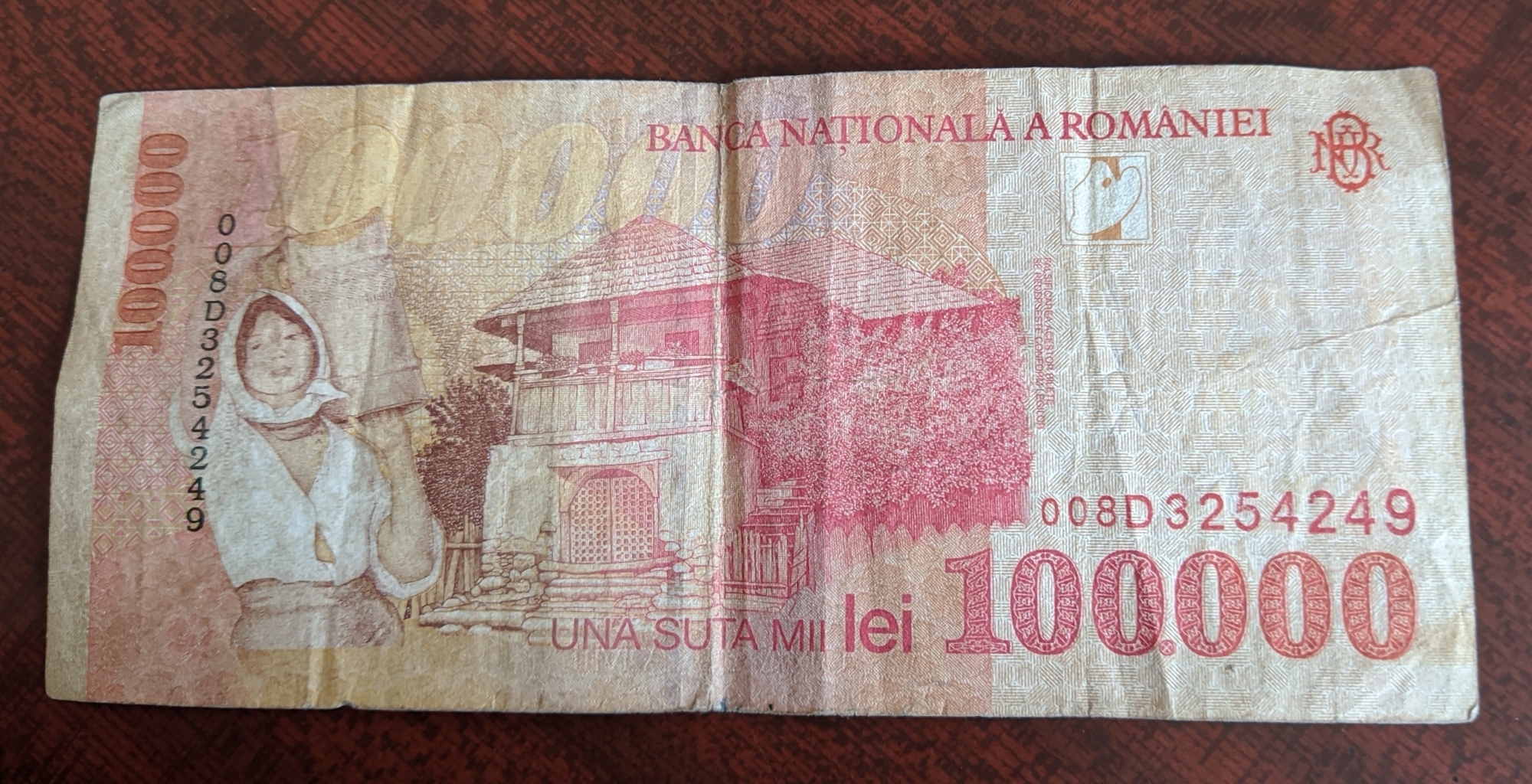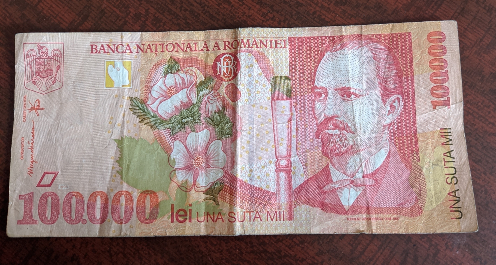 Bancnotă de forma dreptiunghiulară, este imprimată pe hârtie specială, cu filigran, cu fir de siguranţă vertical metalizat complet încorporat și cu fibre bi-fluorescente. Avers: portretul pictorului Nicolae Grigorescu (1838-1907). În centru, un element floral: o floare de nalbă (Althea officinalis), pensula şi paleta artistului. Sus, stema României, denumirea băncii centrale emitente, "BANCA NAŢIONALĂ A ROMÂNIEI", şi medalion cu sigla "B.N.R.". Jos, valoarea nominală în cifre şi litere "100.000 lei UNA SUTA MII". În stânga, semnăturile guvernatorului, casierului central şi anul emisiunii:1998. În dreapta, vertical, valoarea bancnotei. Revers: în centru, este ilustrată o casă din Oltenia, în stânga, imaginea unui pertret de fată, sus, sunt imprimate denumirea băncii centrale "BANCA NAŢIONALĂ A ROMÂNIEI" şi sigla B.N.R. Jos, valoarea nominală ,,100.000”, atât pe verticală cât şi pe orizontală, seria bancnotei: 008D3254249. Pe vertical este redat textul "FALSIFICAREA ACESTOR BILETE SE PEDEPSEŞTE CONFORM LEGILOR".
