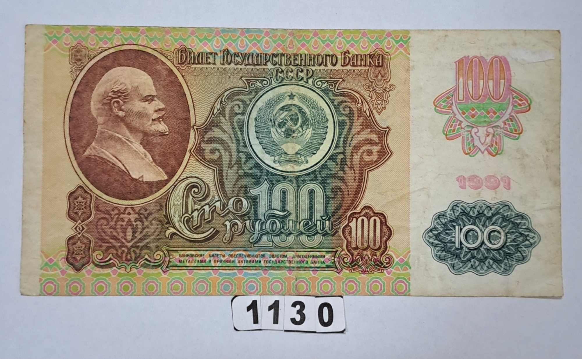 Bancnotă 100 ruble, rusă. Averso; În partea stângă chipul lui V.I.Lenin. În partea dreaptă , cifra 100 cu culori roz, galben, anul ediției 1991, jos 100 . La mijloc ,,БИЛЕТ ГОСУДАРСТВЕННОГО БАНКА СССР'' Сто рублей, 100 . Verso: cifra 100 cu culoare albastră deschisă, imaginea Cremlinului , 100 numărul КХ 4308627 , СТО РУБЛЕЙ , ornamente de diferite culori.