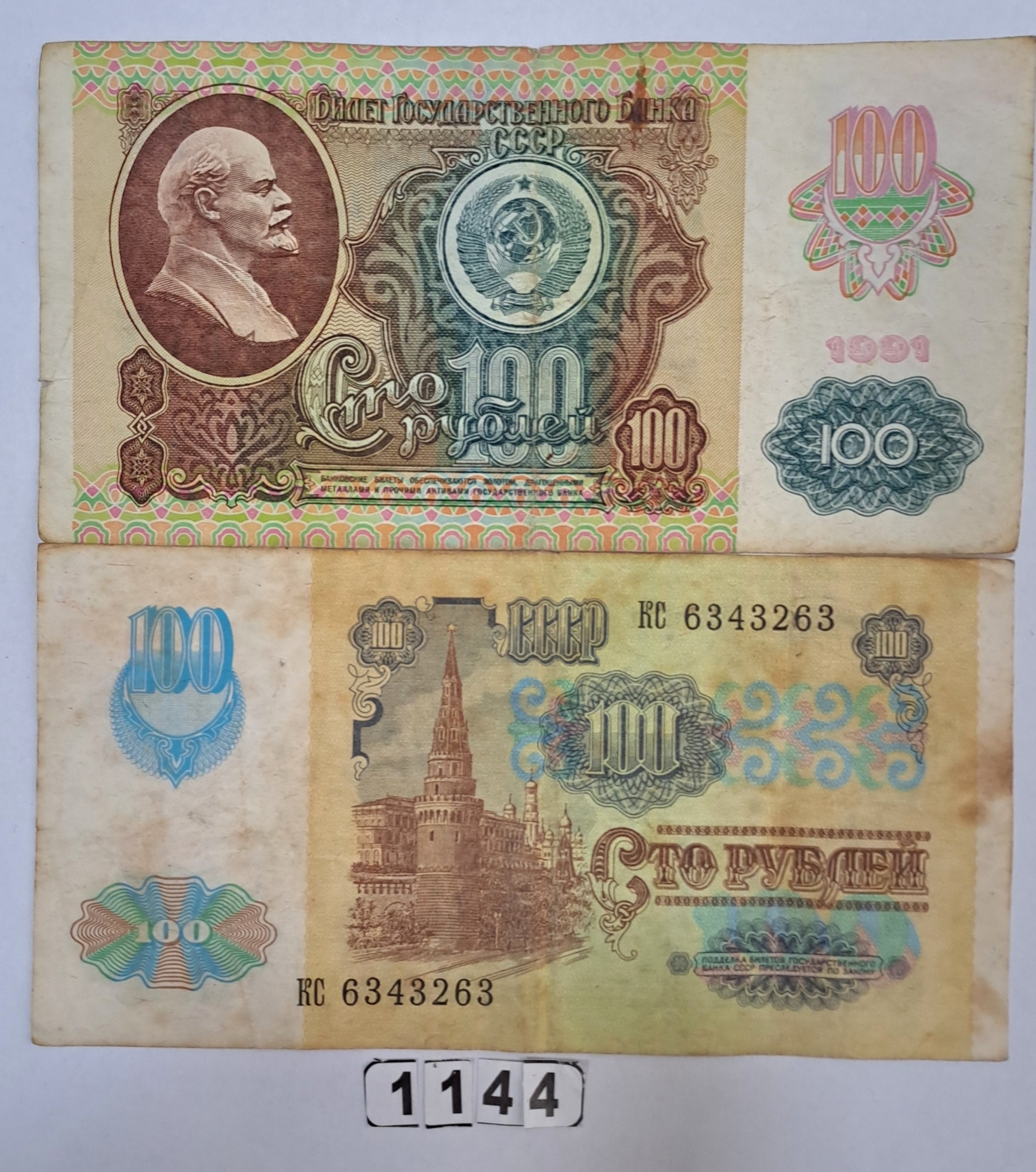Bancnotă 100 ruble, rusă. Averso; În partea stângă chipul lui V.I.Lenin. În partea dreaptă , cifra 100 cu culori roz, galben, anul ediției 1991, jos 100 . La mijloc ,,БИЛЕТ ГОСУДАРСТВЕННОГО БАНКА СССР'' Сто рублей, 100 . Verso: cifra 100 cu culoare albastră deschisă, imaginea Cremlinului , 100 numărul КС 6343263 , СТО РУБЛЕЙ , ornamente de diferite culori.