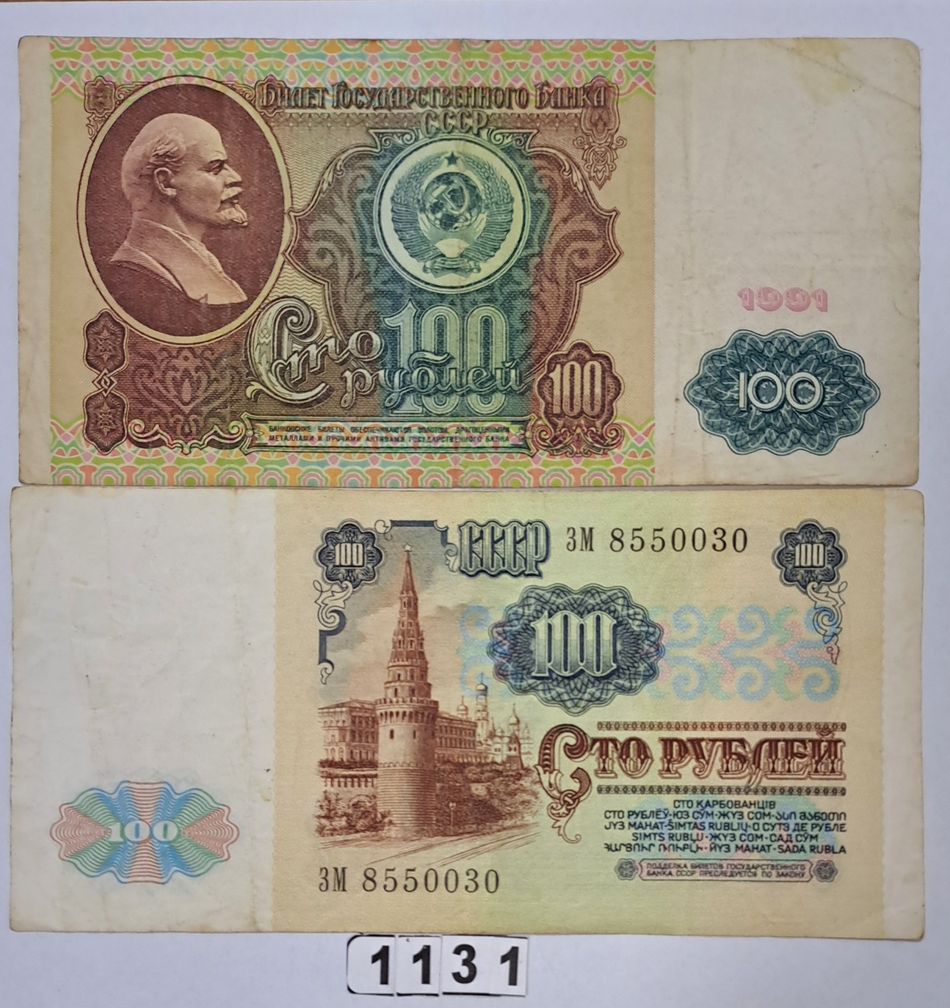 Bancnotă 100 ruble, rusă. Averso; În partea stângă chipul lui V.I.Lenin. În partea dreaptă , anul ediției 1991, jos 100 . La mijloc ,,БИЛЕТ ГОСУДАРСТВЕННОГО БАНКА СССР'' Сто рублей, 100 . Verso: cifra 100 СССР imaginea Cremlinului , 100 numărul ЗМ 8550030 , СТО РУБЛЕЙ , ornamente de diferite culori.