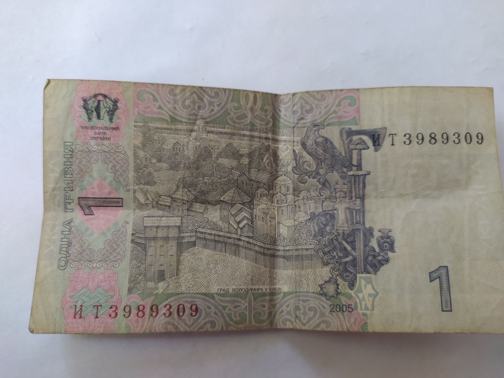 купюра-1 гривень ,ИТ 3989309,2005года выпуска. Номинал-банкнота 1 гривень — это денежная купюра, выпущенная в Украине . Банкнота — это вид денежного знака, печатный документ определенного номинала, выпускаемый центральным банком страны и имеющий обязательную платежную силу на её территории. Для данной банкноты для печати использовали специальную бумагу ,изготовлена из хлопковых волокон ,что обеспечивало ей прочность и устойчивость к износу.