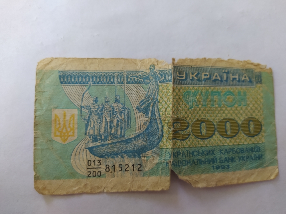 купюра- 2000 купона ,Украина,1993 года выпуска , серийный номер Л 5212. Купюра - это бумажный денежный знак определенного достоинства, используемый в качестве средства платежа. Для данной купюры , для печати использовали специальную бумагу ,изготовлена из хлопковых волокон ,что обеспечивало ей прочность и устойчивость к износу.