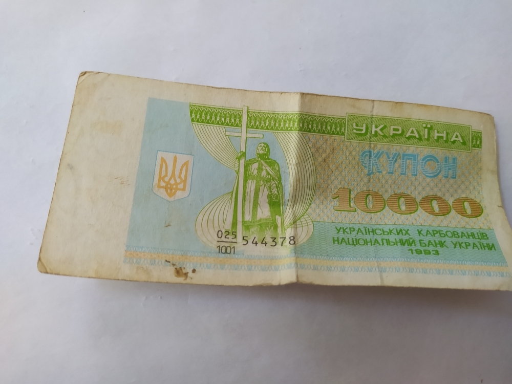 купюра- 10000 купона ,Украина,1993г.ода выпуска , серийный номер 544378. Купюра - это бумажный денежный знак определенного достоинства, используемый в качестве средства платежа. Для данной купюры , для печати использовали специальную бумагу ,изготовлена из хлопковых волокон ,что обеспечивало ей прочность и устойчивость к износу.