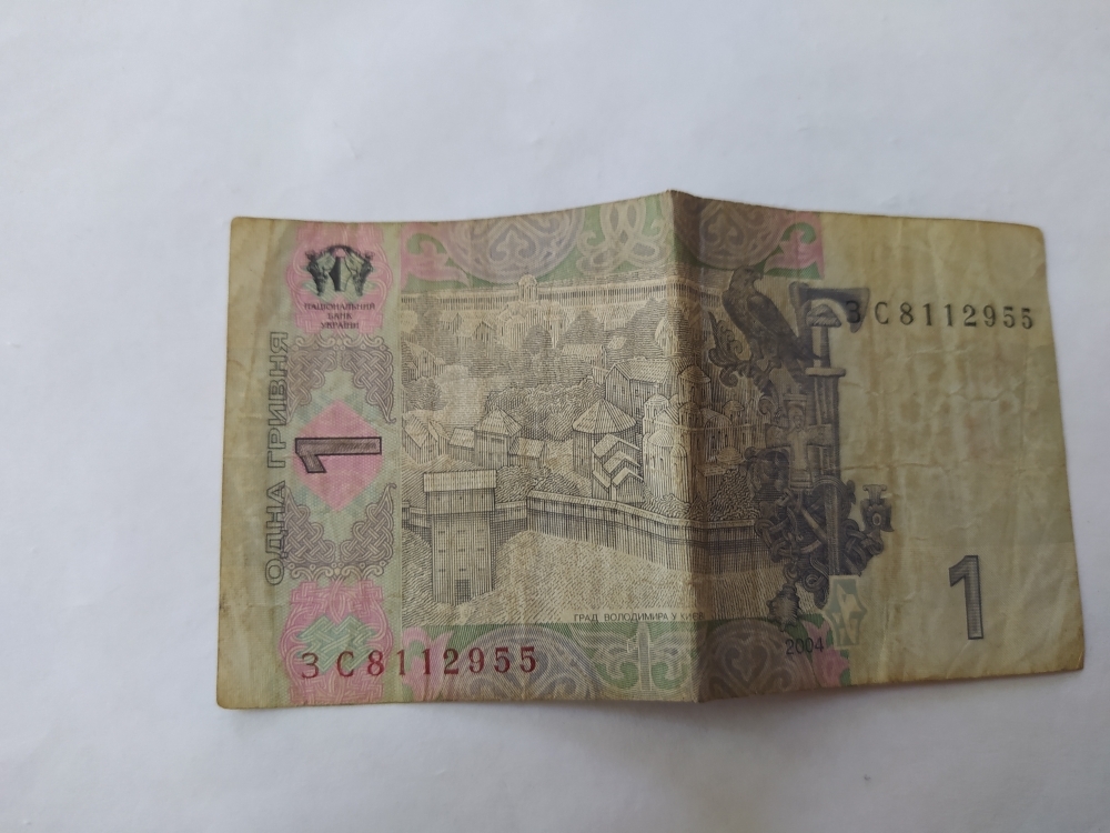 купюра- 1 гривна ,Украина,2004г.ода выпуска ,серийный номер ЗС 8112955. Купюра - это бумажный денежный знак определенного достоинства, используемый в качестве средства платежа. Банкнота — это вид денежного знака, печатный документ определенного номинала, выпускаемый центральным банком страны и имеющий обязательную платежную силу на её территории. Данная банкнота производилась на специализированных предприятиях Гознака, для печати использовали специальную бумагу ,изготовлена из хлопковых волокон ,что обеспечивало ей прочность и устойчивость к износу.