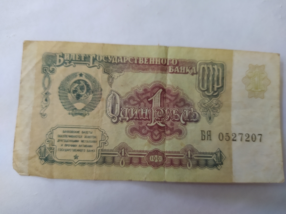 купюра- 1 рубль, серийный номер ВЯ 0527207, 1991 года выпуска. Купюра - это бумажный денежный знак определенного достоинства, используемый в качестве средства платежа. Банкнота — это вид денежного знака, печатный документ определенного номинала, выпускаемый центральным банком страны и имеющий обязательную платежную силу на её территории. Данная банкнота производилась на специализированных предприятиях Гознака, для печати использовали специальную бумагу ,изготовлена из хлопковых волокон ,что обеспечивало ей прочность и устойчивость к износу.