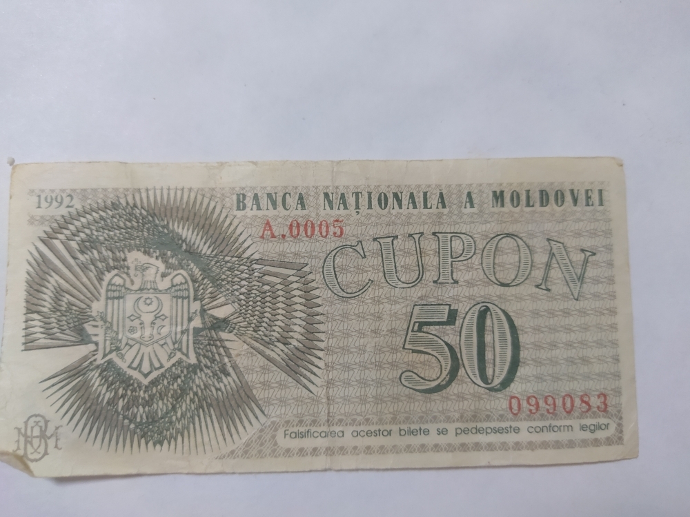 купюра- 50 купонов, Молдова, серийный номер 099083.1992года выпуска. Купюра - это бумажный денежный знак определенного достоинства, используемый в качестве средства платежа. Банкнота — это вид денежного знака, печатный документ определенного номинала, выпускаемый центральным банком страны и имеющий обязательную платежную силу на её территории. Данная банкнота производилась на специализированных предприятиях Гознака, для печати использовали специальную бумагу ,изготовлена из хлопковых волокон ,что обеспечивало ей прочность и устойчивость к износу.