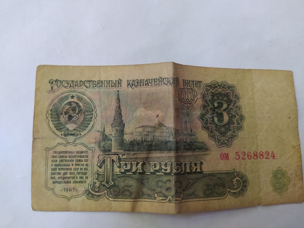 Купюра -3 рубля ,1961года выпуска ,ОМ-5268824. Номинал-банкнота 3 рубля СССР — это денежная купюра, выпущенная в Советском Союзе, номиналом в три рубля. Банкнота — это вид денежного знака, печатный документ определенного номинала, выпускаемый центральным банком страны и имеющий обязательную платежную силу на её территории. Данная банкнота производилась на специализированных предприятиях Гознака, главным образом в Москве и Ленинграде , для печати использовали специальную бумагу ,изготовлена из хлопковых волокон ,что обеспечивало ей прочность и устойчивость к износу.