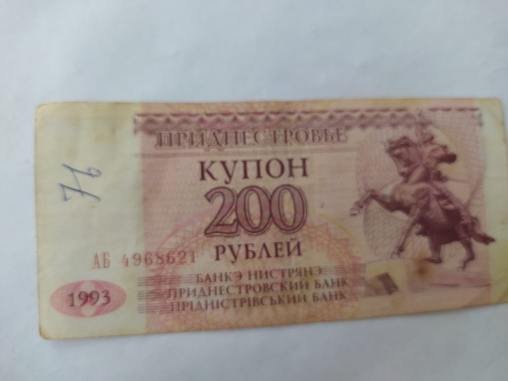 купюра- 200 купонов , серийный номер АБ 4968621 Приднестровье 1993года выпуска. Купюра - это бумажный денежный знак определенного достоинства, используемый в качестве средства платежа. Банкнота — это вид денежного знака, печатный документ определенного номинала, выпускаемый центральным банком страны и имеющий обязательную платежную силу на её территории. Данная банкнота производилась на специализированных предприятиях Гознака, для печати использовали специальную бумагу ,изготовлена из хлопковых волокон ,что обеспечивало ей прочность и устойчивость к износу.