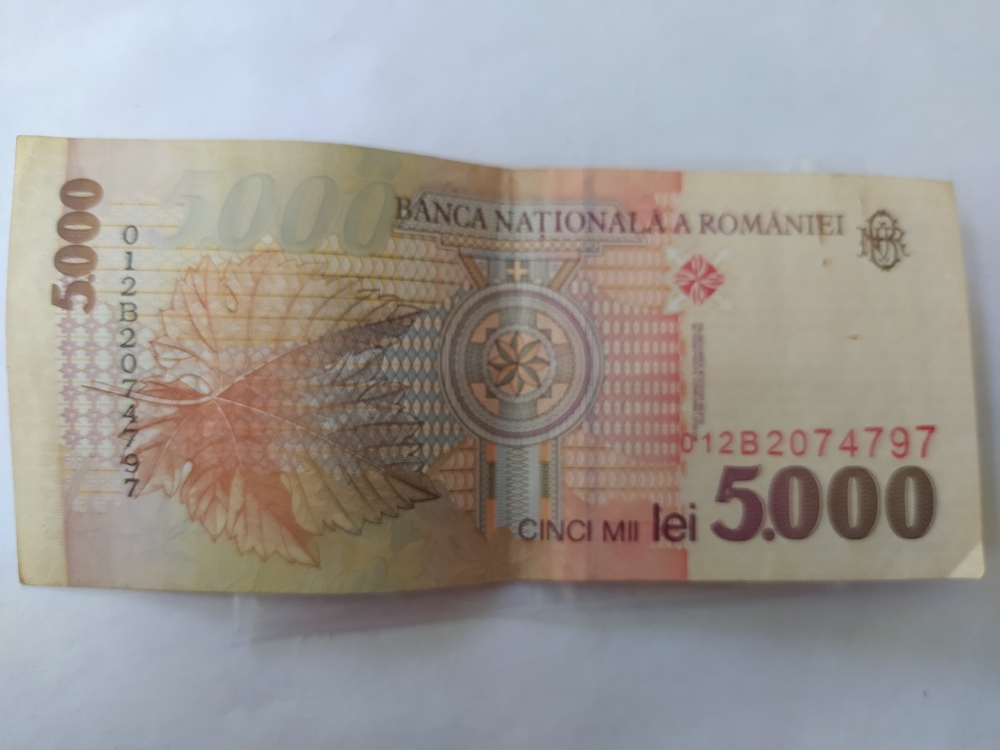 купюра- 5000 lei,Румыния. Серийный номер 012В2074797. Купюра - это бумажный денежный знак определенного достоинства, используемый в качестве средства платежа. Банкнота — это вид денежного знака, печатный документ определенного номинала, выпускаемый центральным банком страны и имеющий обязательную платежную силу на её территории. Данная банкнота производилась на специализированных предприятиях Гознака, для печати использовали специальную бумагу ,изготовлена из хлопковых волокон ,что обеспечивало ей прочность и устойчивость к износу.
