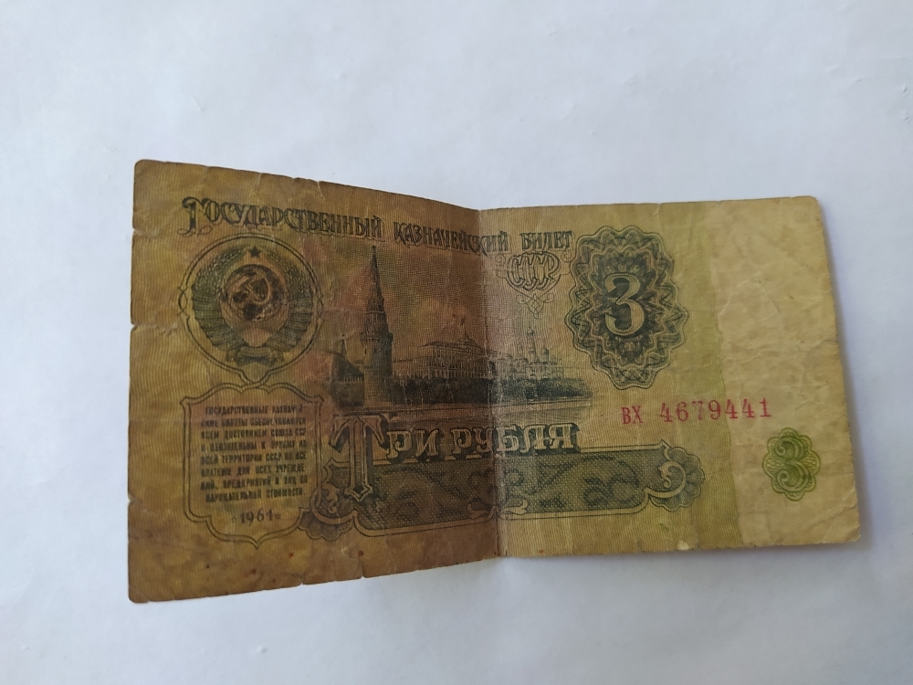 Купюра -3 рубля ,1961года выпуска ,ВХ-4679441. Номинал-банкнота 3 рубля СССР — это денежная купюра, выпущенная в Советском Союзе, номиналом в три рубля. Банкнота — это вид денежного знака, печатный документ определенного номинала, выпускаемый центральным банком страны и имеющий обязательную платежную силу на её территории. Данная банкнота производилась на специализированных предприятиях Гознака, главным образом в Москве и Ленинграде , для печати использовали специальную бумагу ,изготовлена из хлопковых волокон ,что обеспечивало ей прочность и устойчивость к износу.