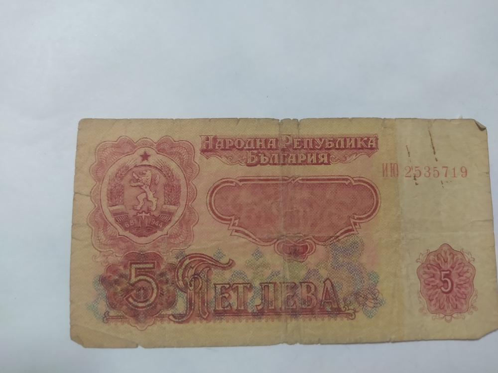купюра- 5 Лева, Болгария , серийный номер ШО 2535719,1974года выпуска . Купюра - это бумажный денежный знак определенного достоинства, используемый в качестве средства платежа. Банкнота — это вид денежного знака, печатный документ определенного номинала, выпускаемый центральным банком страны и имеющий обязательную платежную силу на её территории. Данная банкнота производилась на специализированных предприятиях Гознака, для печати использовали специальную бумагу ,изготовлена из хлопковых волокон ,что обеспечивало ей прочность и устойчивость к износу.