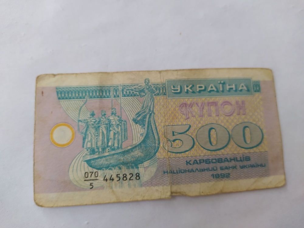купюра- 500 купонов ,445828,Украина 1992года выпуска. Купюра - это бумажный денежный знак определенного достоинства, используемый в качестве средства платежа. Банкнота — это вид денежного знака, печатный документ определенного номинала, выпускаемый центральным банком страны и имеющий обязательную платежную силу на её территории. Данная банкнота производилась на специализированных предприятиях Гознака, для печати использовали специальную бумагу ,изготовлена из хлопковых волокон ,что обеспечивало ей прочность и устойчивость к износу.