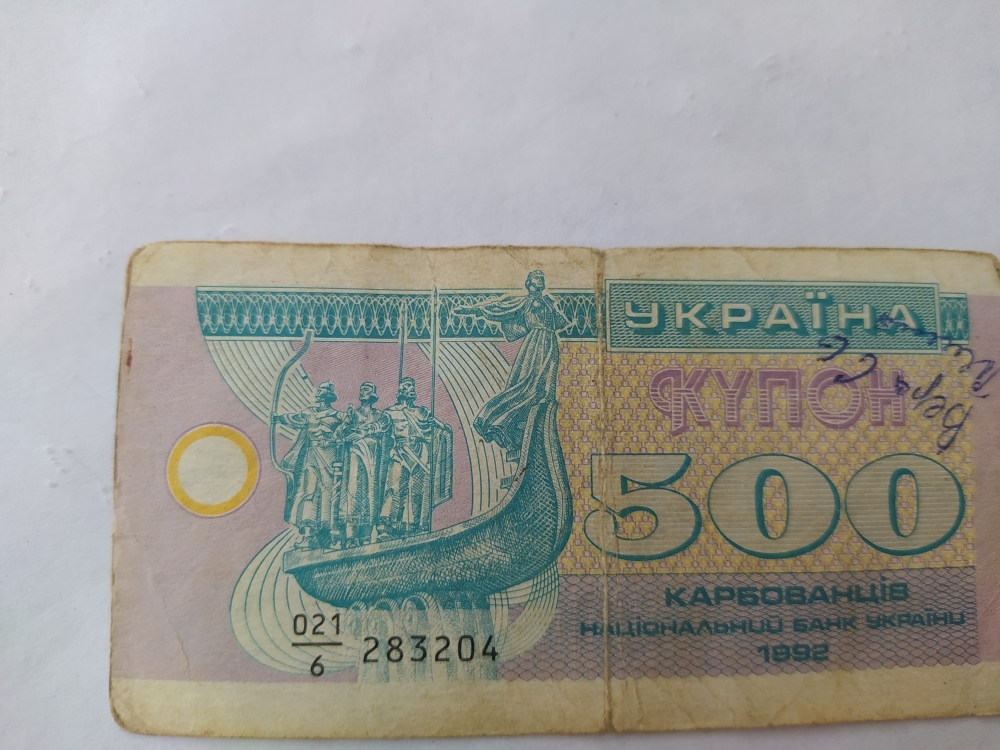 купюра- 500 Купонов,283204,Украина 1992года выпуска. Купюра - это бумажный денежный знак определенного достоинства, используемый в качестве средства платежа. Банкнота — это вид денежного знака, печатный документ определенного номинала, выпускаемый центральным банком страны и имеющий обязательную платежную силу на её территории. Данная банкнота производилась на специализированных предприятиях Гознака, для печати использовали специальную бумагу ,изготовлена из хлопковых волокон ,что обеспечивало ей прочность и устойчивость к износу.