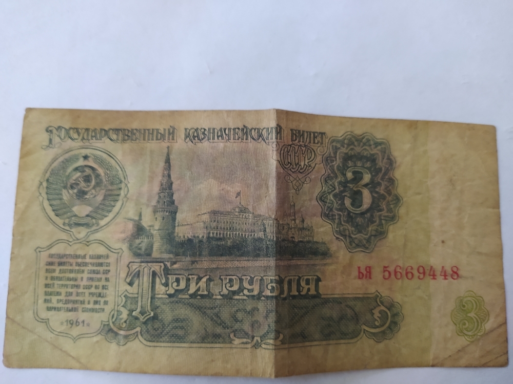 Купюра -3 рубля ,1961года выпуска ,ОЯ-5669448. Номинал-банкнота 3 рубля СССР — это денежная купюра, выпущенная в Советском Союзе, номиналом в три рубля. Банкнота — это вид денежного знака, печатный документ определенного номинала, выпускаемый центральным банком страны и имеющий обязательную платежную силу на её территории. Данная банкнота производилась на специализированных предприятиях Гознака, главным образом в Москве и Ленинграде , для печати использовали специальную бумагу ,изготовлена из хлопковых волокон ,что обеспечивало ей прочность и устойчивость к износу.
