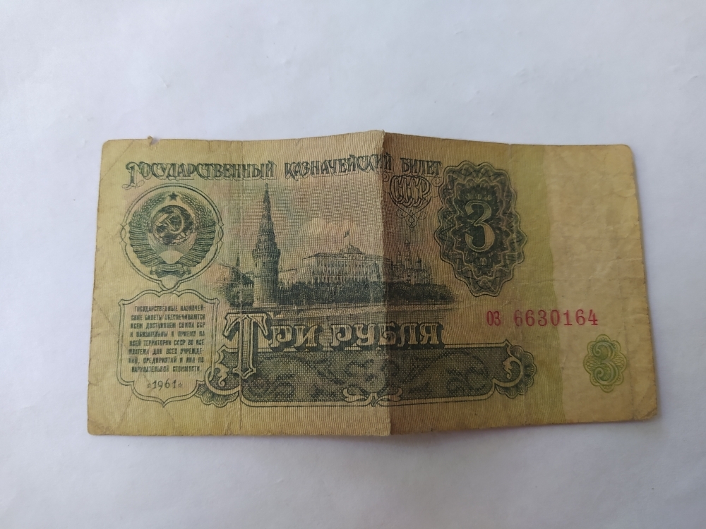 Купюра -3 рубля ,1961года выпуска ,ОЗ-6630164. Номинал-банкнота 3 рубля СССР — это денежная купюра, выпущенная в Советском Союзе, номиналом в три рубля. Банкнота — это вид денежного знака, печатный документ определенного номинала, выпускаемый центральным банком страны и имеющий обязательную платежную силу на её территории. Данная банкнота производилась на специализированных предприятиях Гознака, главным образом в Москве и Ленинграде , для печати использовали специальную бумагу ,изготовлена из хлопковых волокон ,что обеспечивало ей прочность и устойчивость к износу.