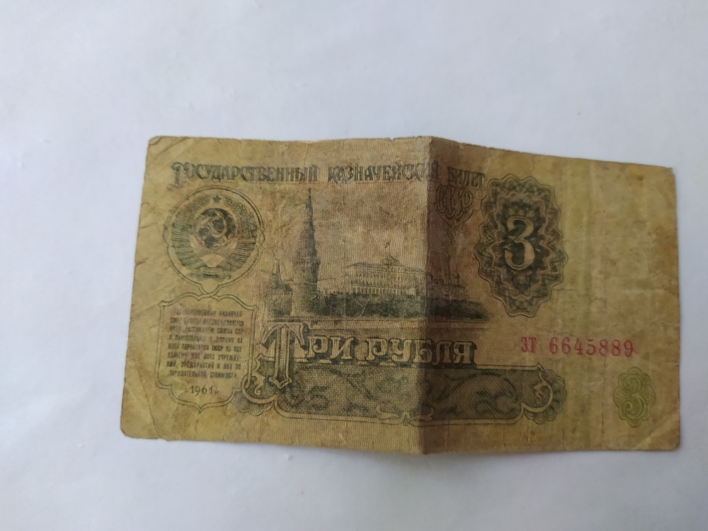 купюра-3 рубля ,ЗТ 6645589,1961года выпуска. Номинал-банкнота 3 рубля СССР — это денежная купюра, выпущенная в Советском Союзе, номиналом в три рубля. Банкнота — это вид денежного знака, печатный документ определенного номинала, выпускаемый центральным банком страны и имеющий обязательную платежную силу на её территории. Данная банкнота производилась на специализированных предприятиях Гознака, главным образом в Москве и Ленинграде , для печати использовали специальную бумагу ,изготовлена из хлопковых волокон ,что обеспечивало ей прочность и устойчивость к износу.