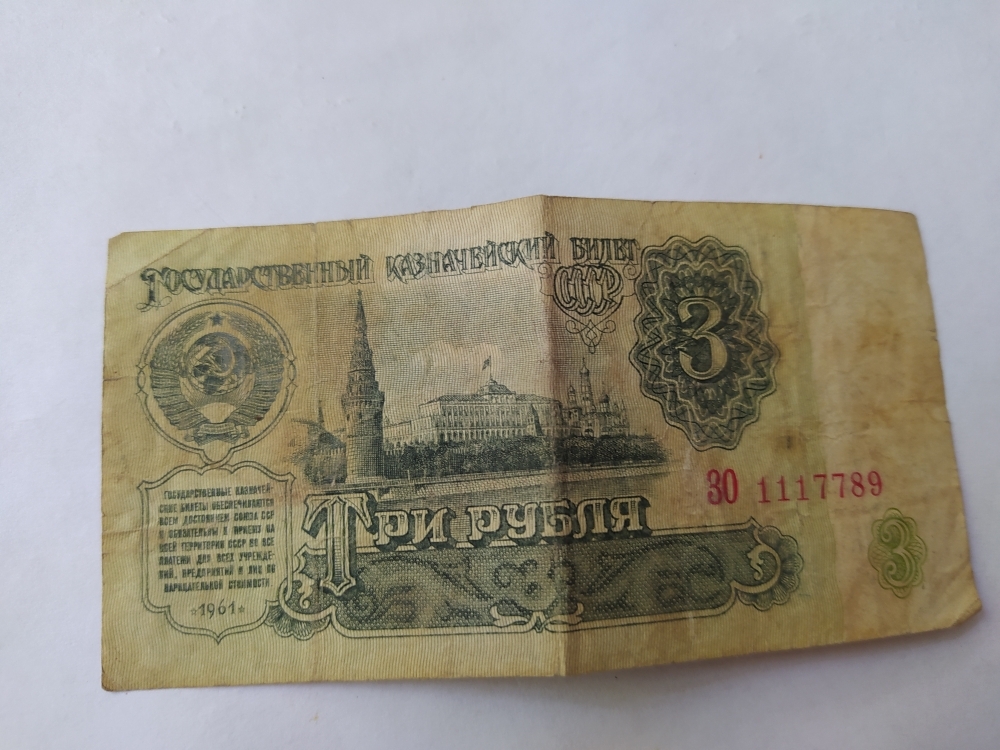 купюра 1961года выпуска - 3 рубля ,ЗО 1117789. Номинал-банкнота 3 рубля СССР — это денежная купюра, выпущенная в Советском Союзе, номиналом в три рубля. Банкнота — это вид денежного знака, печатный документ определенного номинала, выпускаемый центральным банком страны и имеющий обязательную платежную силу на её территории. Данная банкнота производилась на специализированных предприятиях Гознака, главным образом в Москве и Ленинграде , для печати использовали специальную бумагу ,изготовлена из хлопковых волокон ,что обеспечивало ей прочность и устойчивость к износу.
