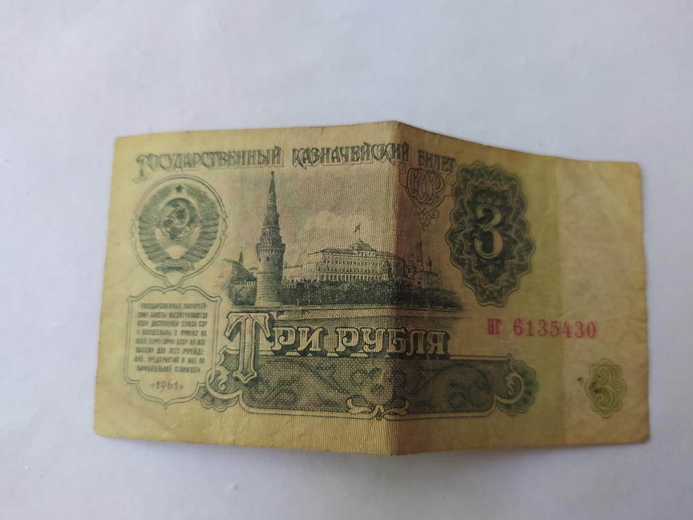 купюра-3 рубля ,МГ 6135430 1961года выпуска . Номинал-банкнота 3 рубля СССР — это денежная купюра, выпущенная в Советском Союзе, номиналом в три рубля. Банкнота — это вид денежного знака, печатный документ определенного номинала, выпускаемый центральным банком страны и имеющий обязательную платежную силу на её территории. Данная банкнота производилась на специализированных предприятиях Гознака, главным образом в Москве и Ленинграде , для печати использовали специальную бумагу ,изготовлена из хлопковых волокон ,что обеспечивало ей прочность и устойчивость к износу.