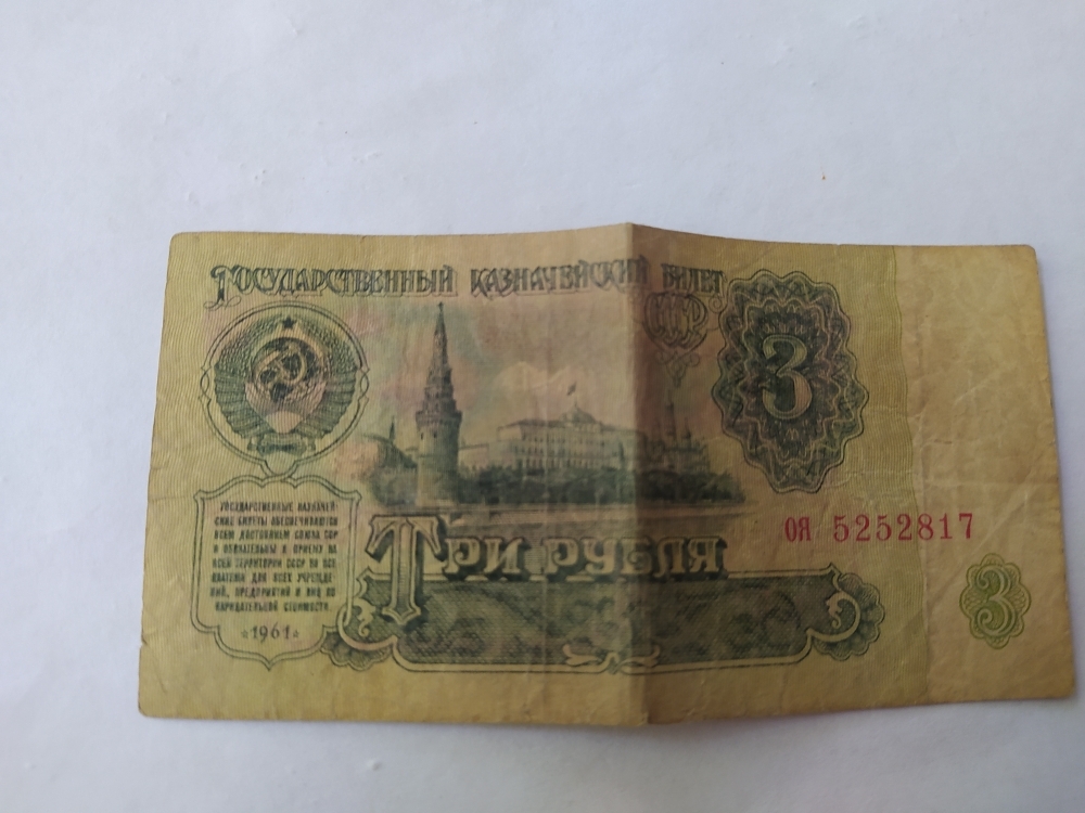 купюра-3 рубля, ОЯ 5252817,1961года выпуска. Номинал-банкнота 3 рубля СССР — это денежная купюра, выпущенная в Советском Союзе, номиналом в три рубля. Банкнота — это вид денежного знака, печатный документ определенного номинала, выпускаемый центральным банком страны и имеющий обязательную платежную силу на её территории. Данная банкнота производилась на специализированных предприятиях Гознака, главным образом в Москве и Ленинграде , для печати использовали специальную бумагу ,изготовлена из хлопковых волокон ,что обеспечивало ей прочность и устойчивость к износу.