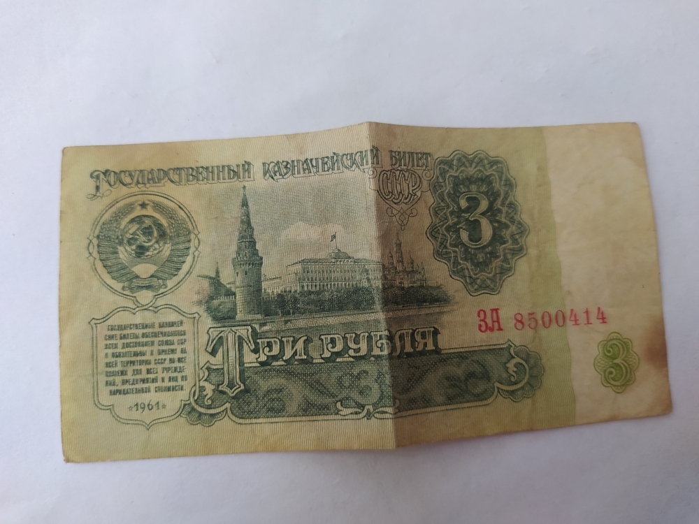 купюра-3 рубля, ЗА 8500414 ,1961года выпуска. Номинал-банкнота 3 рубля СССР — это денежная купюра, выпущенная в Советском Союзе, номиналом в три рубля. Банкнота — это вид денежного знака, печатный документ определенного номинала, выпускаемый центральным банком страны и имеющий обязательную платежную силу на её территории. Данная банкнота производилась на специализированных предприятиях Гознака, главным образом в Москве и Ленинграде , для печати использовали специальную бумагу ,изготовлена из хлопковых волокон ,что обеспечивало ей прочность и устойчивость к износу.