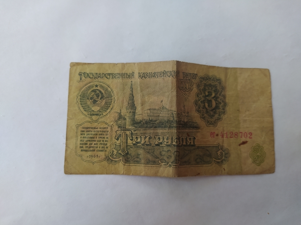 купюра-3 рубля, ЕГ 4128702,1961года выпуска. Номинал-банкнота 3 рубля СССР — это денежная купюра, выпущенная в Советском Союзе, номиналом в три рубля. Банкнота — это вид денежного знака, печатный документ определенного номинала, выпускаемый центральным банком страны и имеющий обязательную платежную силу на её территории. Данная банкнота производилась на специализированных предприятиях Гознака, главным образом в Москве и Ленинграде , для печати использовали специальную бумагу ,изготовлена из хлопковых волокон ,что обеспечивало ей прочность и устойчивость к износу.