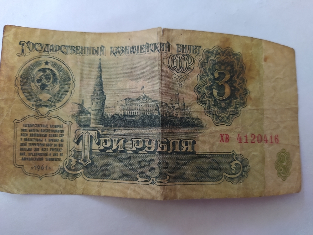 купюра-3 рубля, ХВ 4120416,1961года выпуска. Номинал-банкнота 3 рубля СССР — это денежная купюра, выпущенная в Советском Союзе, номиналом в три рубля. Банкнота — это вид денежного знака, печатный документ определенного номинала, выпускаемый центральным банком страны и имеющий обязательную платежную силу на её территории. Данная банкнота производилась на специализированных предприятиях Гознака, главным образом в Москве и Ленинграде , для печати использовали специальную бумагу ,изготовлена из хлопковых волокон ,что обеспечивало ей прочность и устойчивость к износу.