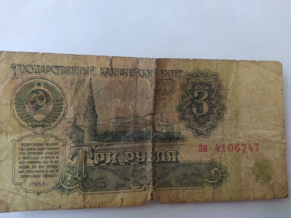 купюра-3 рубля,ПХ4106747,1961года выпуска. Номинал-банкнота 3 рубля СССР — это денежная купюра, выпущенная в Советском Союзе, номиналом в три рубля. Банкнота — это вид денежного знака, печатный документ определенного номинала, выпускаемый центральным банком страны и имеющий обязательную платежную силу на её территории. Данная банкнота производилась на специализированных предприятиях Гознака, главным образом в Москве и Ленинграде , для печати использовали специальную бумагу ,изготовлена из хлопковых волокон ,что обеспечивало ей прочность и устойчивость к износу.