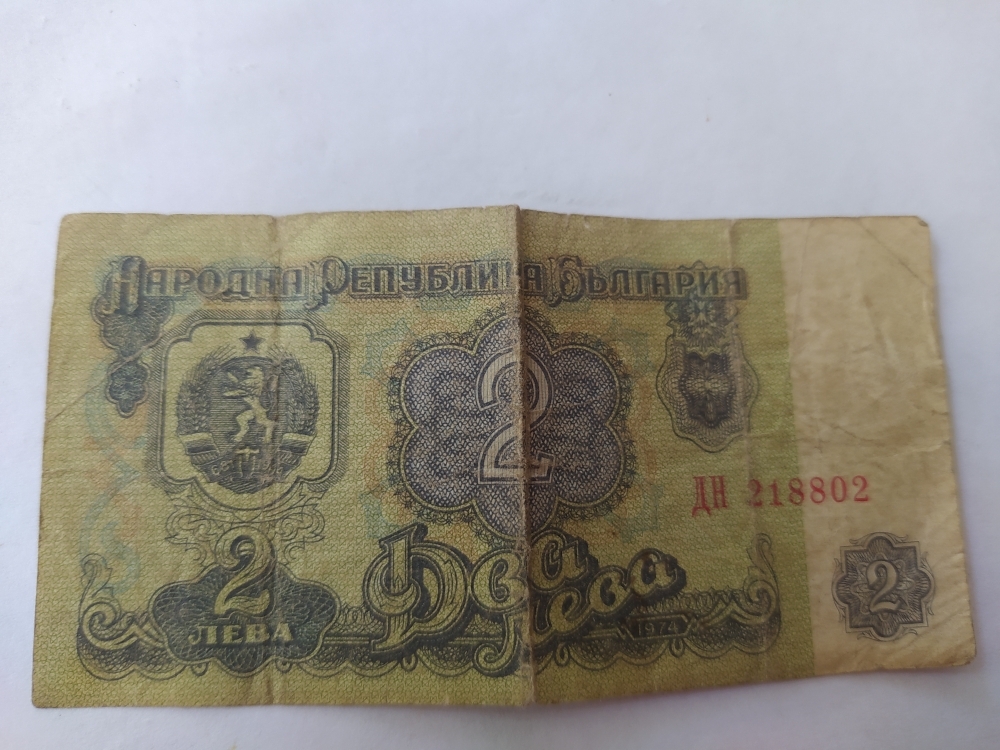 купюра-2 лева ,DH 218802, 1974 года выпуска. Банкнота — это вид денежного знака, печатный документ определенного номинала, выпускаемый центральным банком страны и имеющий обязательную платежную силу на её территории. Данная банкнота производилась на специализированных предприятиях Гознака , для печати использовали специальную бумагу ,изготовлена из хлопковых волокон ,что обеспечивало ей прочность и устойчивость к износу.