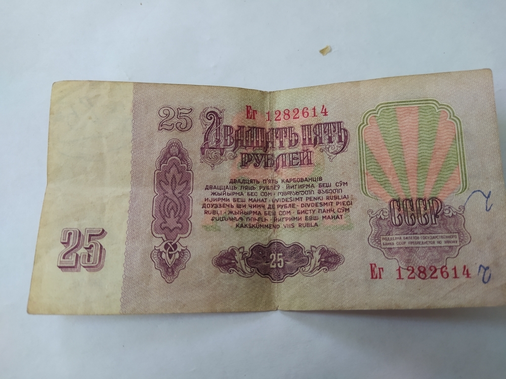 купюра-25 рубля,Er 1282614,1961года выпуска. Номинал-банкнота 25 рублей СССР — это денежная купюра, выпущенная в Советском Союзе, номиналом в 25 рубля. Банкнота — это вид денежного знака, печатный документ определенного номинала, выпускаемый центральным банком страны и имеющий обязательную платежную силу на её территории. Данная банкнота производилась на специализированных предприятиях Гознака, главным образом в Москве и Ленинграде , для печати использовали специальную бумагу ,изготовлена из хлопковых волокон ,что обеспечивало ей прочность и устойчивость к износу.