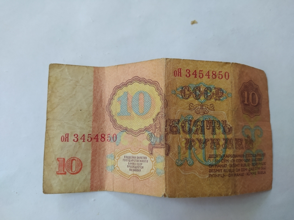 купюра-10 рублей ,ОЯ 3454850, Номинал-банкнота 10 рублей СССР — это денежная купюра, выпущенная в Советском Союзе, номиналом в 10 рубля. Банкнота — это вид денежного знака, печатный документ определенного номинала, выпускаемый центральным банком страны и имеющий обязательную платежную силу на её территории. Данная банкнота производилась на специализированных предприятиях Гознака, главным образом в Москве и Ленинграде , для печати использовали специальную бумагу ,изготовлена из хлопковых волокон ,что обеспечивало ей прочность и устойчивость к износу.
