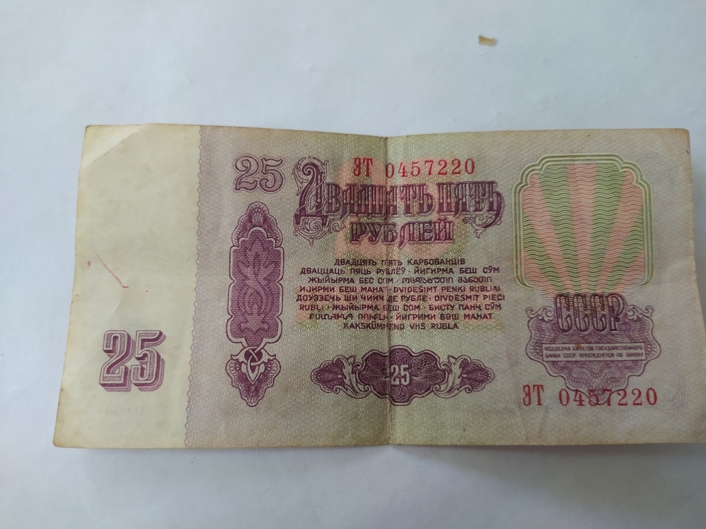 купюра-25 рублей, ЗТ 0457220,1961 года выпуска. Номинал-банкнота 25 рублей СССР — это денежная купюра, выпущенная в Советском Союзе, номиналом в 25 рубля. Банкнота — это вид денежного знака, печатный документ определенного номинала, выпускаемый центральным банком страны и имеющий обязательную платежную силу на её территории. Данная банкнота производилась на специализированных предприятиях Гознака, главным образом в Москве и Ленинграде , для печати использовали специальную бумагу ,изготовлена из хлопковых волокон ,что обеспечивало ей прочность и устойчивость к износу.