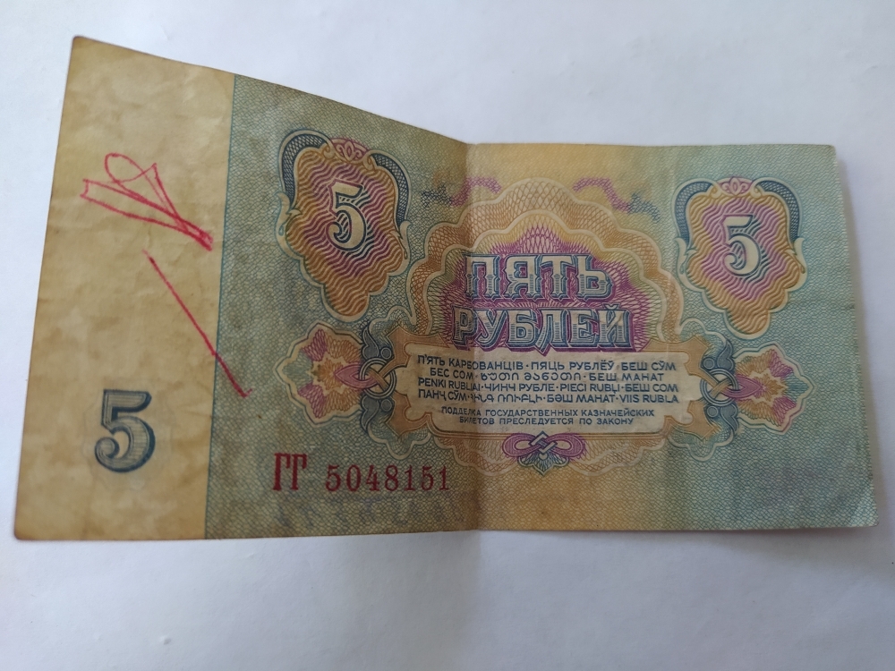 купюра-5 рублей, ГГ 5048151,1961года выпуска. Номинал-банкнота 5 рублей СССР — это денежная купюра, выпущенная в Советском Союзе, номиналом в 5 рубля. Банкнота — это вид денежного знака, печатный документ определенного номинала, выпускаемый центральным банком страны и имеющий обязательную платежную силу на её территории. Данная банкнота производилась на специализированных предприятиях Гознака, главным образом в Москве и Ленинграде , для печати использовали специальную бумагу ,изготовлена из хлопковых волокон ,что обеспечивало ей прочность и устойчивость к износу.