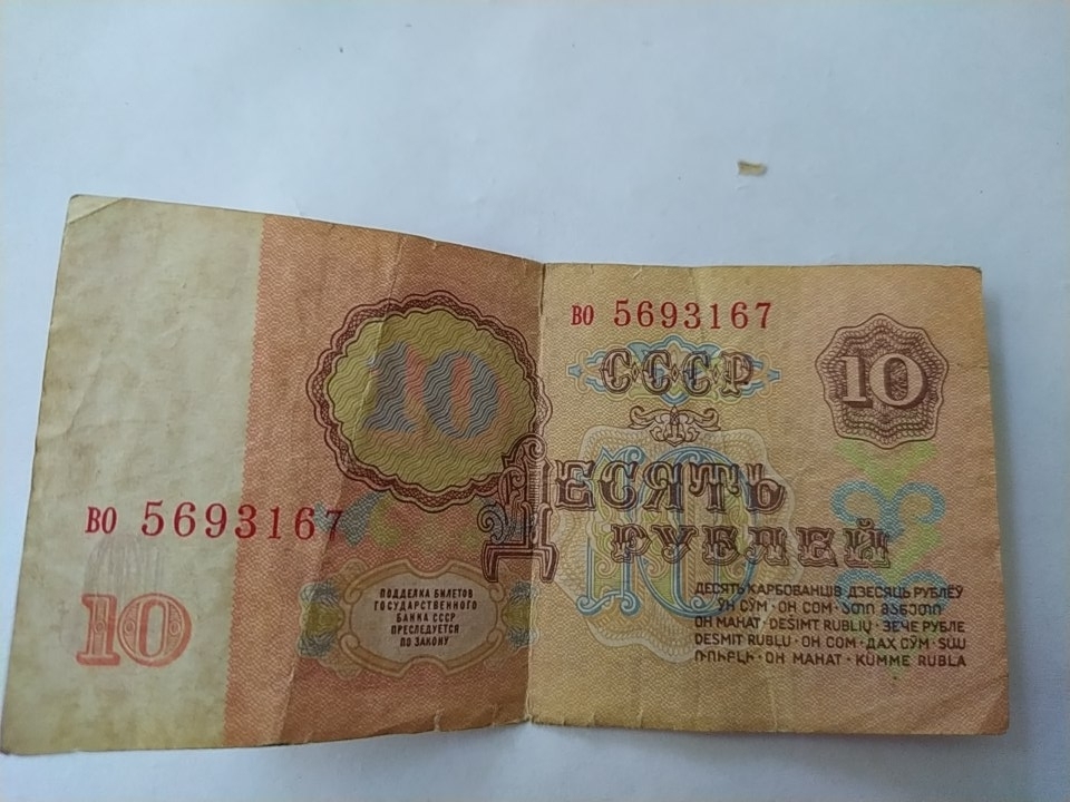 купюра-10 рублей, ВО 5693167,1961года выпуска. Номинал-банкнота 10 рублей СССР — это денежная купюра, выпущенная в Советском Союзе, номиналом в 10рубля. Банкнота — это вид денежного знака, печатный документ определенного номинала, выпускаемый центральным банком страны и имеющий обязательную платежную силу на её территории. Данная банкнота производилась на специализированных предприятиях Гознака, главным образом в Москве и Ленинграде , для печати использовали специальную бумагу ,изготовлена из хлопковых волокон ,что обеспечивало ей прочность и устойчивость к износу.