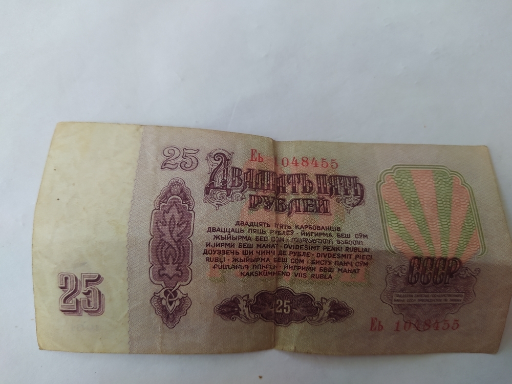купюра-25 рублей,eb 1048455,1961года выпуска. Номинал-банкнота 25 рублей СССР — это денежная купюра, выпущенная в Советском Союзе, номиналом в 25 рубля. Банкнота — это вид денежного знака, печатный документ определенного номинала, выпускаемый центральным банком страны и имеющий обязательную платежную силу на её территории. Данная банкнота производилась на специализированных предприятиях Гознака, главным образом в Москве и Ленинграде , для печати использовали специальную бумагу ,изготовлена из хлопковых волокон ,что обеспечивало ей прочность и устойчивость к износу.