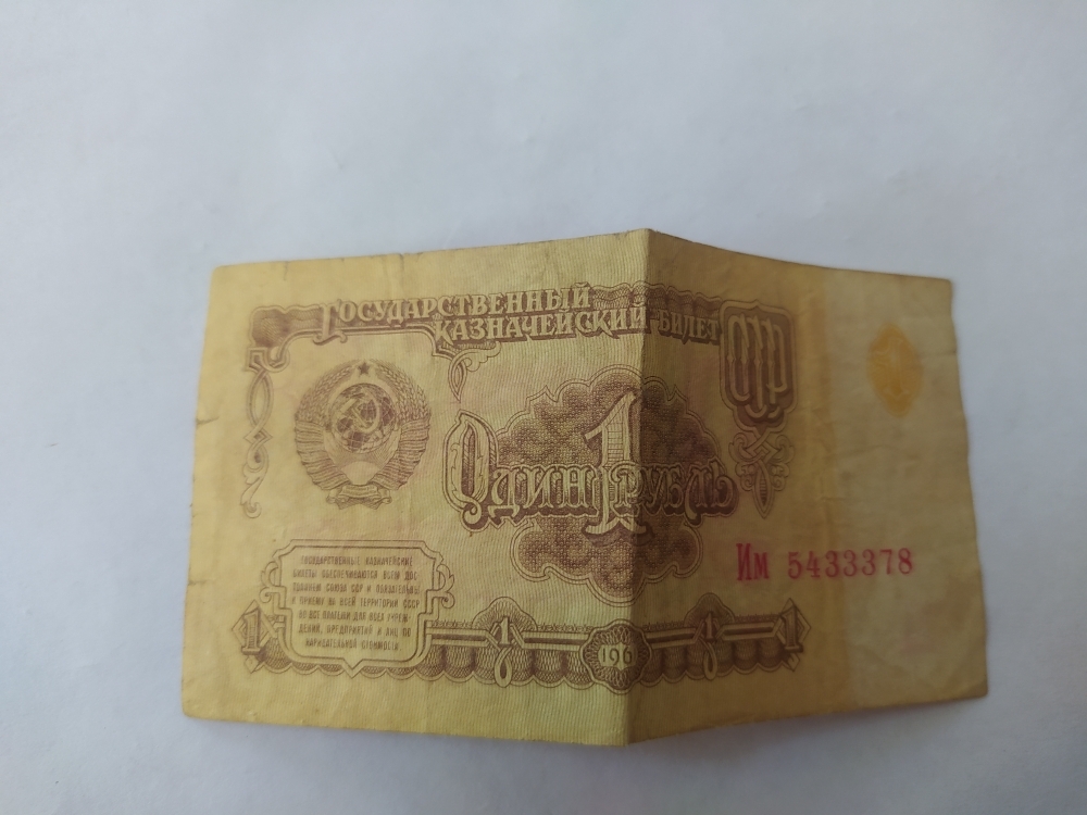 купюра-1 рубль, ИМ 5433378,1961года выпуска. Номинал-банкнота 1 рубль СССР — это денежная купюра, выпущенная в Советском Союзе, номиналом в 1 рубль. Банкнота — это вид денежного знака, печатный документ определенного номинала, выпускаемый центральным банком страны и имеющий обязательную платежную силу на её территории. Данная банкнота производилась на специализированных предприятиях Гознака, главным образом в Москве и Ленинграде , для печати использовали специальную бумагу ,изготовлена из хлопковых волокон ,что обеспечивало ей прочность и устойчивость к износу.