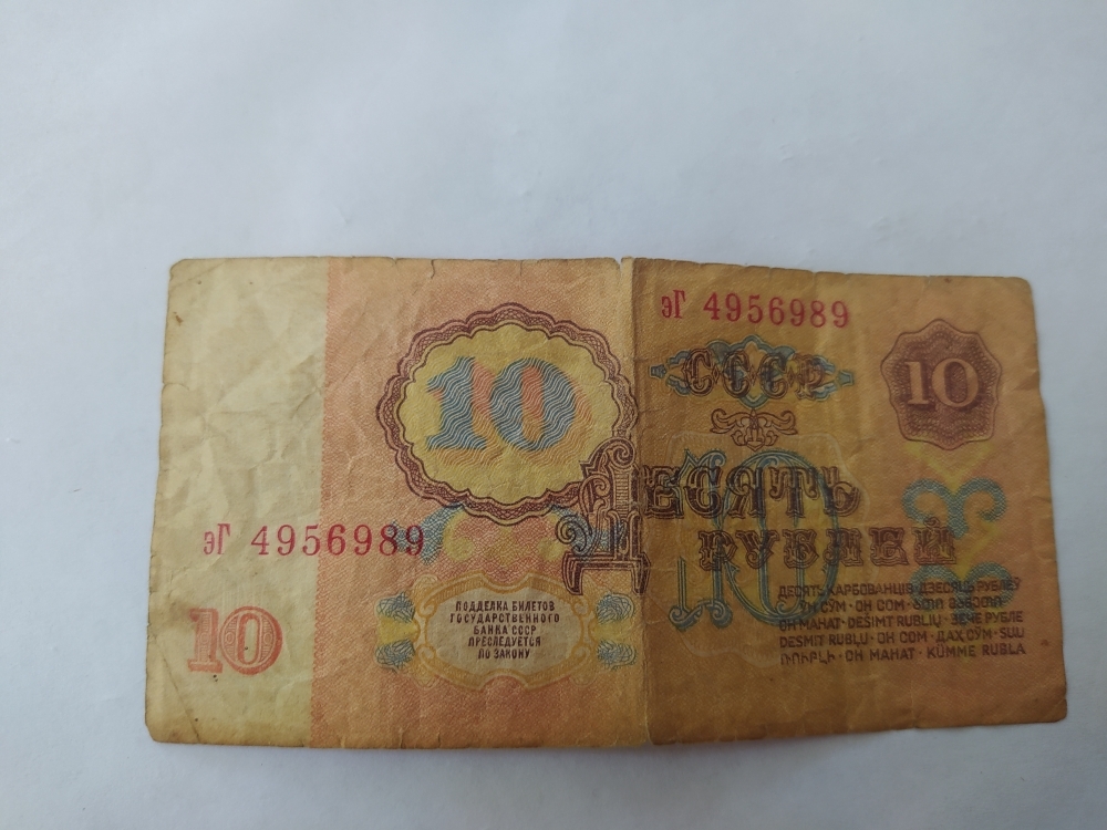 купюра-10 рублей, ЭГ 4956989,1961года выпуска. Номинал-банкнота 10 рублей СССР — это денежная купюра, выпущенная в Советском Союзе, номиналом в 10 рубля. Банкнота — это вид денежного знака, печатный документ определенного номинала, выпускаемый центральным банком страны и имеющий обязательную платежную силу на её территории. Данная банкнота производилась на специализированных предприятиях Гознака, главным образом в Москве и Ленинграде , для печати использовали специальную бумагу ,изготовлена из хлопковых волокон ,что обеспечивало ей прочность и устойчивость к износу.