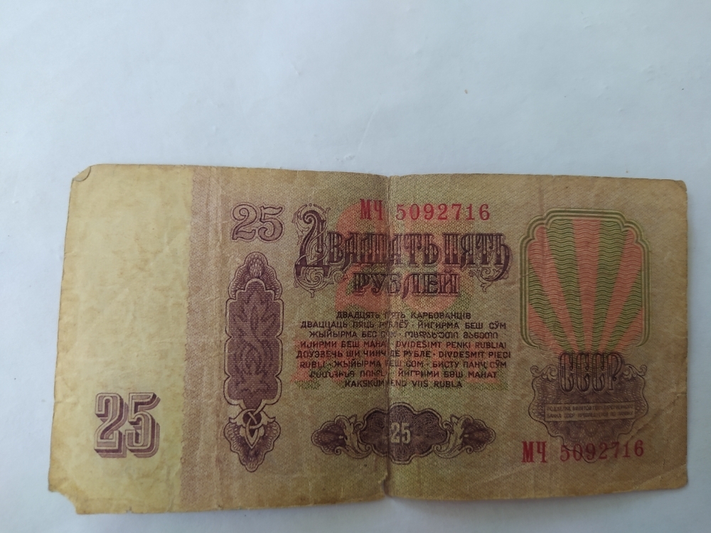 купюра-25 рублей,М4 5092716,1961года выпуска. Номинал-банкнота 25 рублей СССР — это денежная купюра, выпущенная в Советском Союзе, номиналом в 25 рубля. Банкнота — это вид денежного знака, печатный документ определенного номинала, выпускаемый центральным банком страны и имеющий обязательную платежную силу на её территории. Данная банкнота производилась на специализированных предприятиях Гознака, главным образом в Москве и Ленинграде , для печати использовали специальную бумагу ,изготовлена из хлопковых волокон ,что обеспечивало ей прочность и устойчивость к износу.