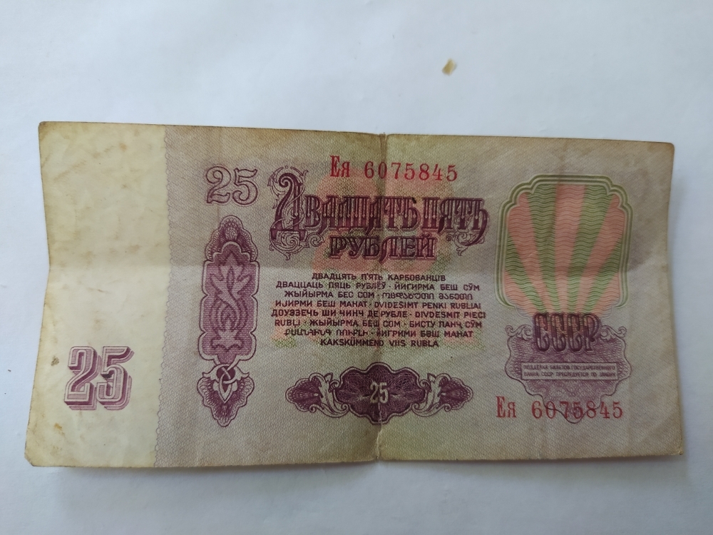 купюра-25 рублей ,ЕЯ 6075845,1961года выпуска. Номинал-банкнота 25 рублей СССР — это денежная купюра, выпущенная в Советском Союзе, номиналом в 25 рубля. Банкнота — это вид денежного знака, печатный документ определенного номинала, выпускаемый центральным банком страны и имеющий обязательную платежную силу на её территории. Данная банкнота производилась на специализированных предприятиях Гознака, главным образом в Москве и Ленинграде , для печати использовали специальную бумагу ,изготовлена из хлопковых волокон ,что обеспечивало ей прочность и устойчивость к износу.